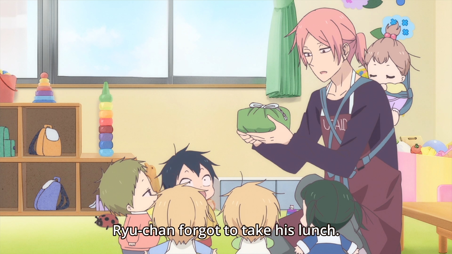 In the second story, Ryuichi forgets his bento box back at the daycare room. That’s no big deal, right? Yoshihito just has to send a text and tell the guy to come pick it up, right?