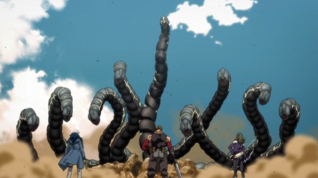 Also, I’m okay with the episode skipping the three Makai warriors fighting giant worms. They’re just enormous worms. I’d rather have Garo’s battle with the monster trucks animated than the giant worms.