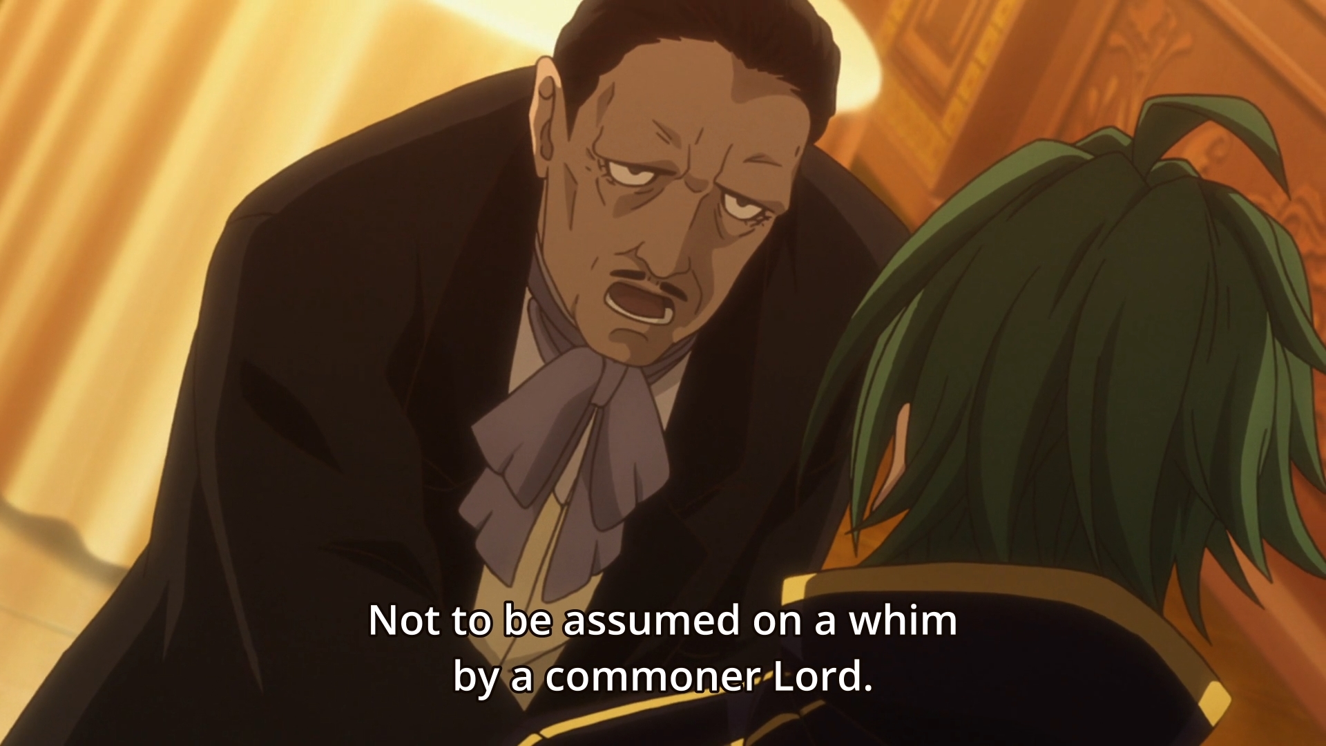 What else did I like? Eh, just the assassination attempt at the end of the episode. Shortly after Theo’s conversation with Alexis, the Marquis of Jalucia tries to leave when they fall under attack. After a near brush with death, our heroes discover that the assassins are men who have been mind-controlled by Rossini. Yes, that Rossini; he even has to look obviously evil. At yet another banquet full of uptight lords and dancing maidens, Theo had bumped into his arch-nemesis, and they proceeded to exchange tense words. Clearly, Rossini was annoyed by that encounter, so he sent people to take out Theo. Unfortunately for him, Alexis got caught in the middle, so Siluca speculates that the asshole will be kicked out of Union. And if that happens, it means Theo can go after him. Sure. Bring it on. Anything to take me away from the mundane examples of diplomacy and contentious meet-and-greets. That’s the only reason I sorta like the assassination attempt. First, it’s some much needed action after like 20 minutes of non-stop conversations. Plus, it also pushes the plot in motion. It’s not that the action was great or anything, but we get to meet an old face we haven’t seen in a while. I’ll always take a cat over a pair of ugly wolves.
