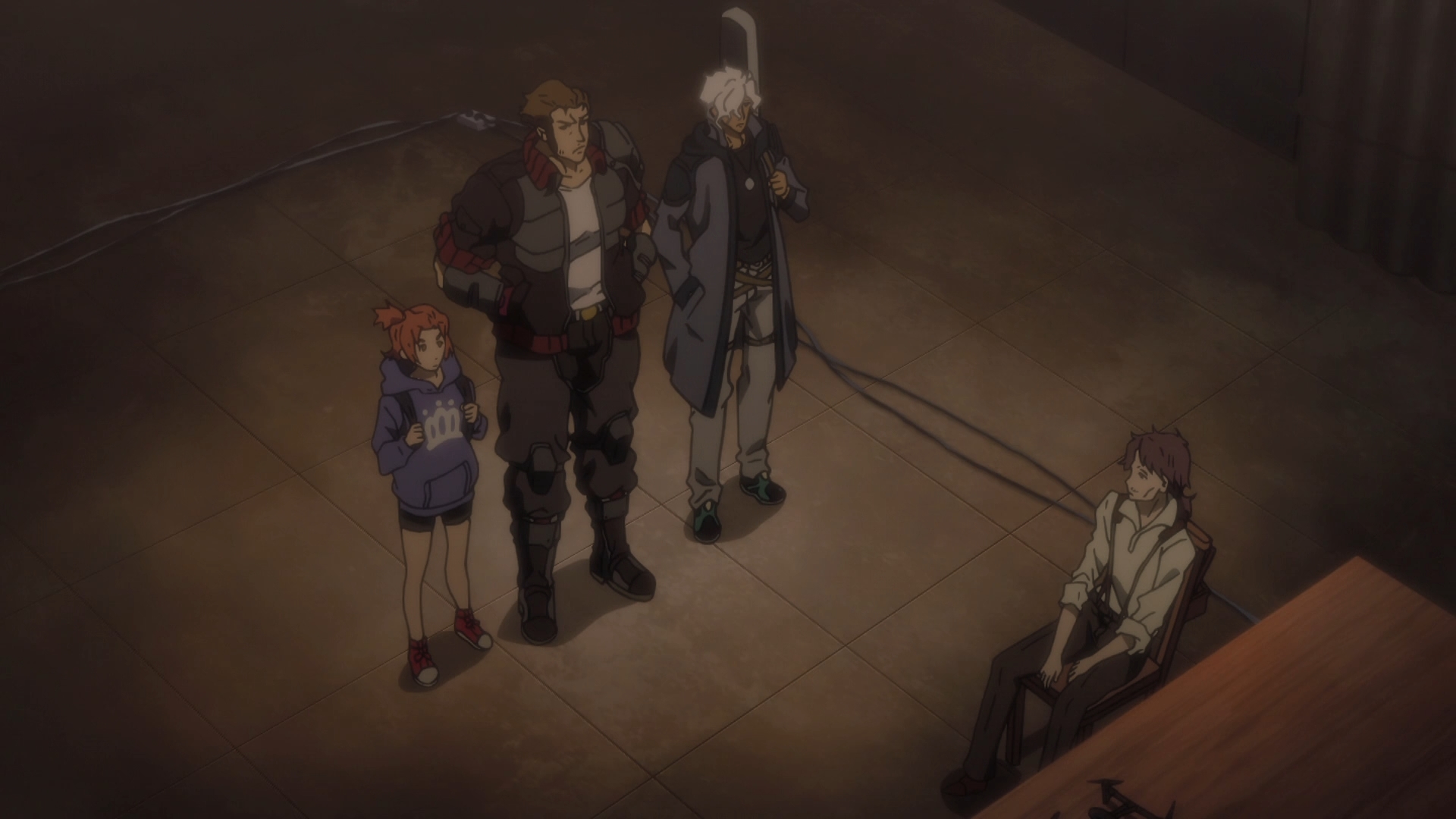 Sophie eventually catches the attention of some mysterious guy on ELDO NET, and he tells her to come to a secret location. There, they find a former employee of GarEden. He stumbled upon a great big secret about the company and the city around it, so he’s been hiding out ever since. How long has he been here, though? How does he eat? How does he shower? How come this empty building has all the power he needs and requires? Again, I just feel disengaged from the episode because the world-building feels lacking. Even the revelation that a mysterious individual not only helped him, but knows about Sword isn’t really doing much to draw me in. Then magically, he’s been found out, so a bunch of Horrors dressed in riot gear shows up to crash the party. At first, it seems like our heroes are outnumbered, but then Sophie suddenly gets a vision of a girl with Horror-like eyes… and she now has the ability to control the cameras and lights of the building on her phone? Eh…