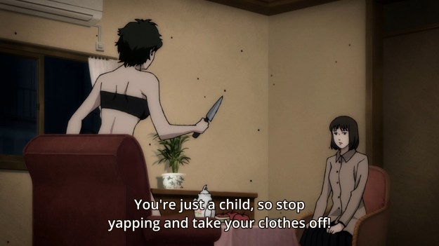 When the girl finally manages to find her aunt in this labyrinthian mess of a town, she finds a woman who has given up on the idea of privacy altogether. Instead, she prances around in her underwear. I think she’s supposed to be naked, but this got (understandably) censored. Hey, it’s cool if she wants to be naked; it’s her life, after all. But the lady starts trying to force her niece to go nude as well. Like I said, it feels like “Town with No Roads” should’ve been four different stories. As it is, it’s kind of all over the place. For instance, why on earth did her family start peeping on her? I guess they are also from this town, so they’ve inherited that perverted trait, but then why move away at all? Why do they peep on her and her only? Why did they only start peeping as of recently? Ah well…