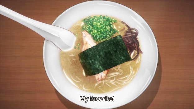 The girls are on summer vacation, but I literally don’t care. The other characters are alright, but Yuu and Yuu alone pretty much ruins the entire story for me. I hate characters like her. I know it’s exaggerated for the sake of the anime, but it’s not even done in a funny way. The girl’s just pathetic. As a result, I’m just here for the ramen. Unfortunately, I can’t tell if the bowl pictured above has any gimmick to it. Maybe it doesn’t; I think it’s just plain ol’ shoyu ramen. Also, I don’t like eating ramen in the summer. Or any steaming hot food, really. Contrary to popular belief, I do not feel cooler afterwards unless it’s really spicy. A bowl of hearty ramen wold probably make my body overheat in hot weather.