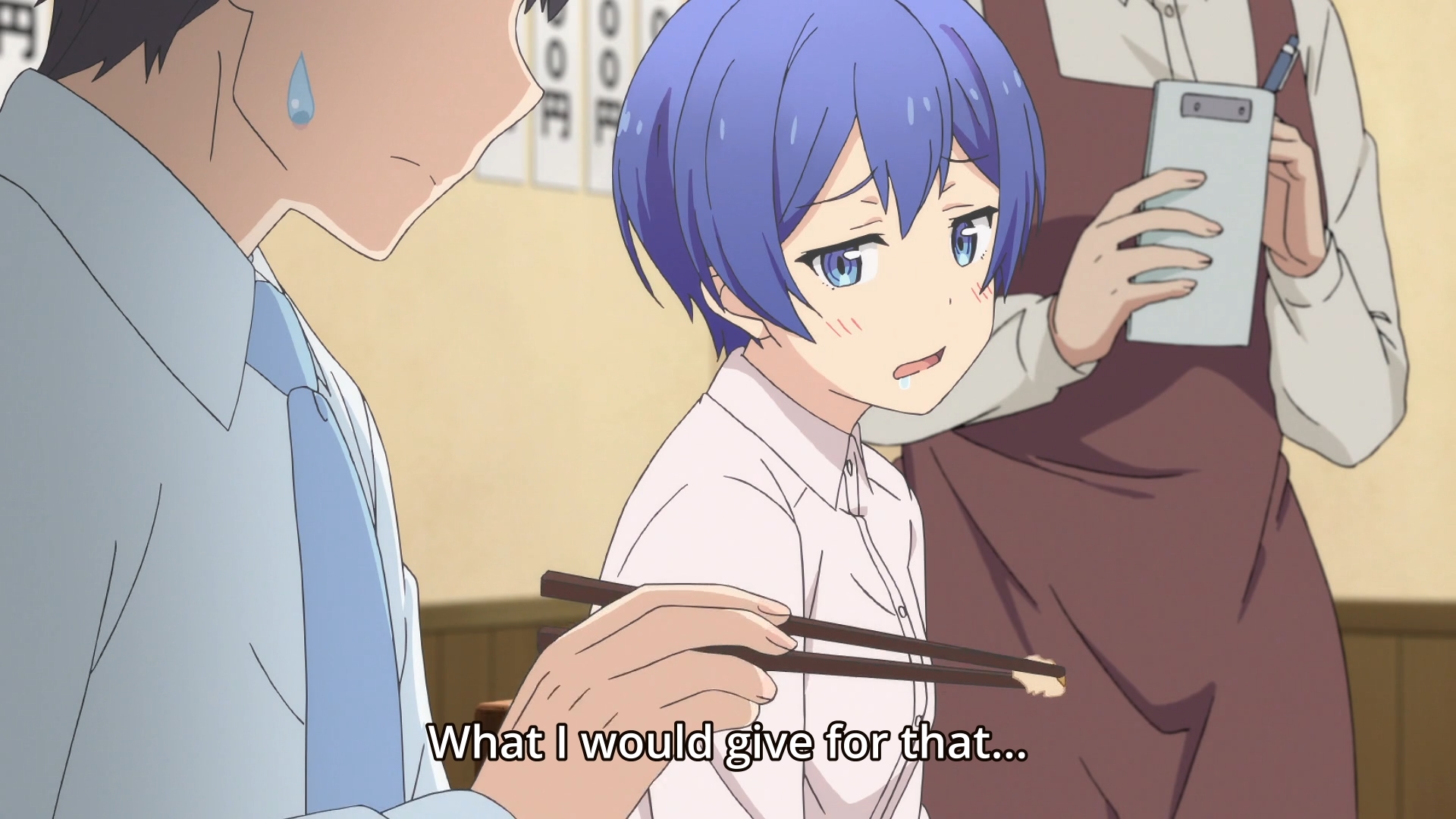 Still no Hotaru. Boo. Boo this anime. So Coconuts visits the recently-opened conbini next to his dagashi shop, and he ends up running into the owner Yutaka Beni. This guy apparently loves convenience stores as much as Hotaru likes dagashi. Unfortunately, he also lacks common sense since he’s trying to sell 3500-yen cakes in the boonies. As a result of Coconuts pointing this out to him, he would like to recruit his competition to work for him instead; this would kill two birds with one stone. At first, Beni tries to lure the kid with an 850-yen salary, but when that doesn’t work, he also offers Coconuts the privilege to buy dirty magazines discreetly. But who still needs to buy dirty magazines in this day and age? Can’t you find all the smut you need online? I mean, I’d understand it if Coconuts was an old man who didn’t know his way around a computer, but surely, a resourceful kid like him can look up porn online. He could even find Dagashi Kashi smut if he really wanted. Still, our virtuous hero manages to resist the temptation thanks to Hotaru’s image suddenly flashing through his mind. Well, her bust size is certainly drawn like she’s straight out of a dirty magazine…