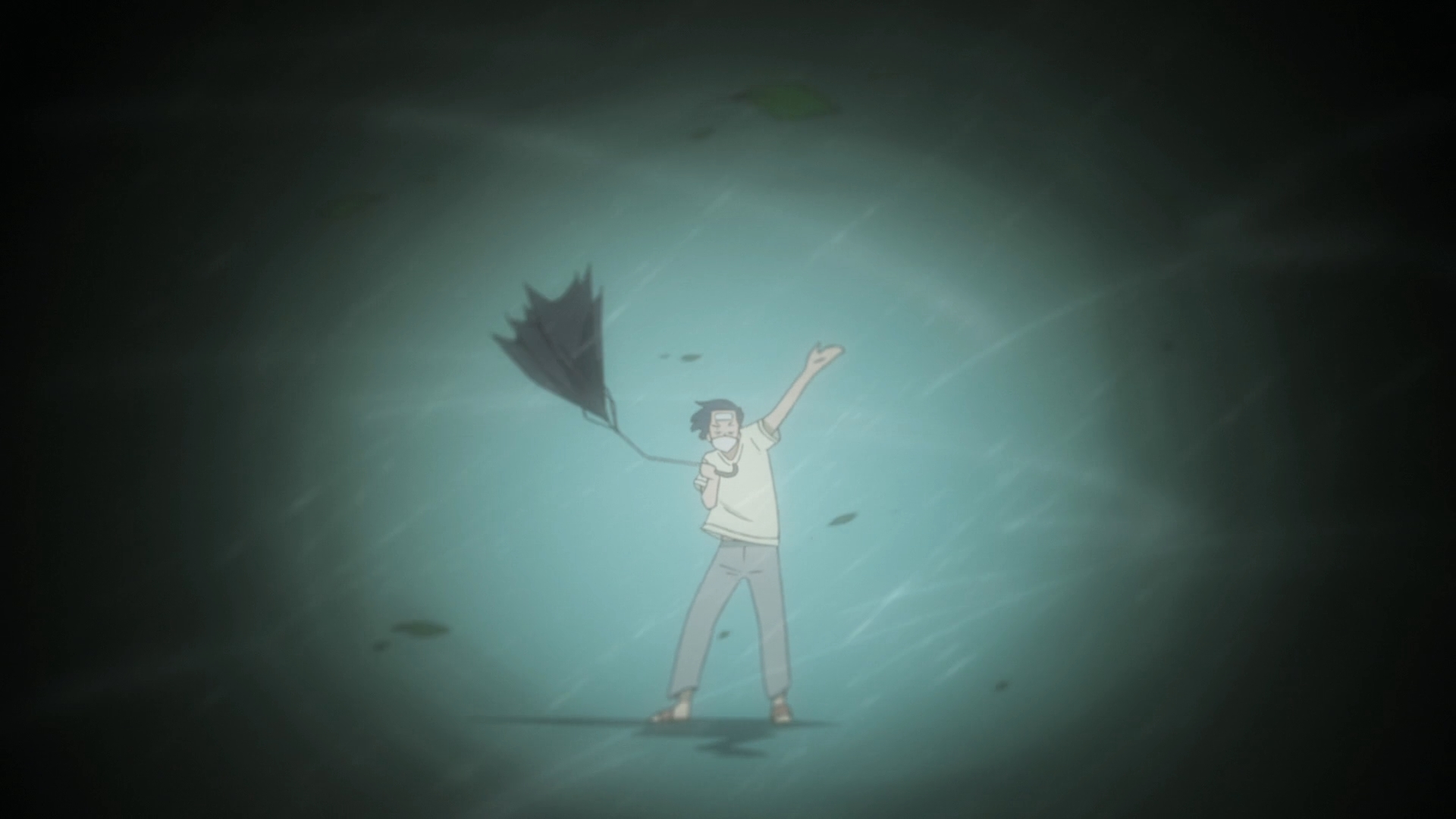 — Kondo: “You know nothing about me.” Cold, but true. She’s just being kinda childish, right now. Childish doesn’t always mean annoying or bratty. She’s being childish in her unflinching adoration of a man she barely even knows outside of work. Most of us don’t know our coworkers. Everyone wears a mask to work. And just like that, it begins to rain outside. The weather seems oddly in sync with Akira’s mental state.