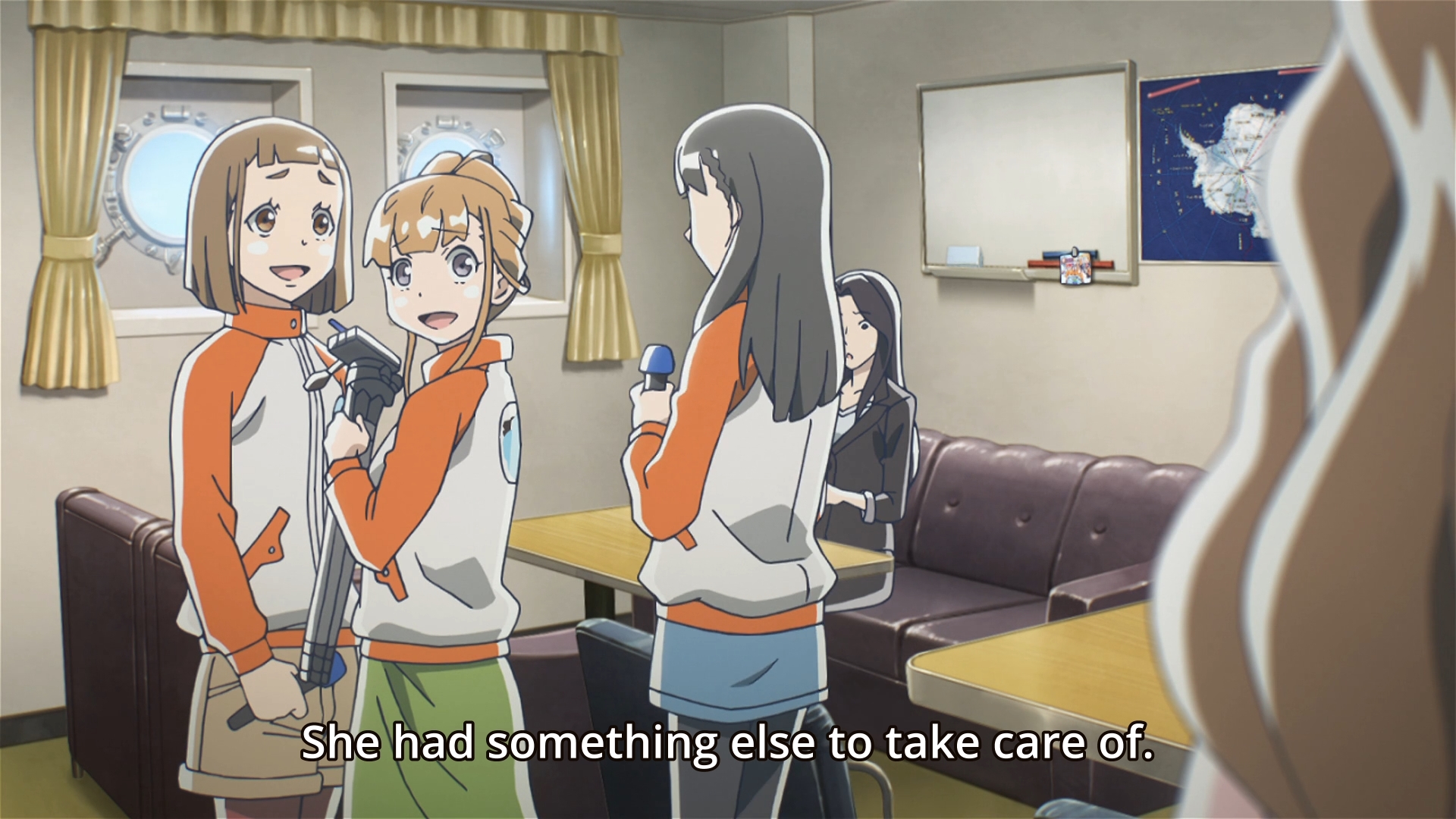 Kanae is right: Shirase has often mentioned that her mother is waiting for her, and no matter what she means by that — whether she’s being figurative or not — she needs someone to talk to. Her own friends don’t really know the extent of Shirase’s pain, and even if they did, they aren’t equipped to deal with it. On the other hand, we naturally assume that Gin can help the girl. Not only has she lost a close friend, she’s also come to terms with it… presumably. If we make that reasonable assumption, then who better to talk to Shirase than Gin, right? But again, that’s assuming that Gin has gotten over Takako’s death. And even if she has, it’s still going to be a tough conversation with her best friend’s daughter. If she’s the selfish sort, she might even think that it isn’t her responsibility. Gin doesn’t seem like the self-centered type, though. It’s just complicated. It doesn’t help that Gin had to call off the search for Takako, which she must feel guilty about. As a result, she must naturally wonder if Shirase resents her for it. A search party in Antarctica is more than likely prohibitively expensive, so you can’t reasonably spend much time looking for a lost person, but a grieving child might not understand that.