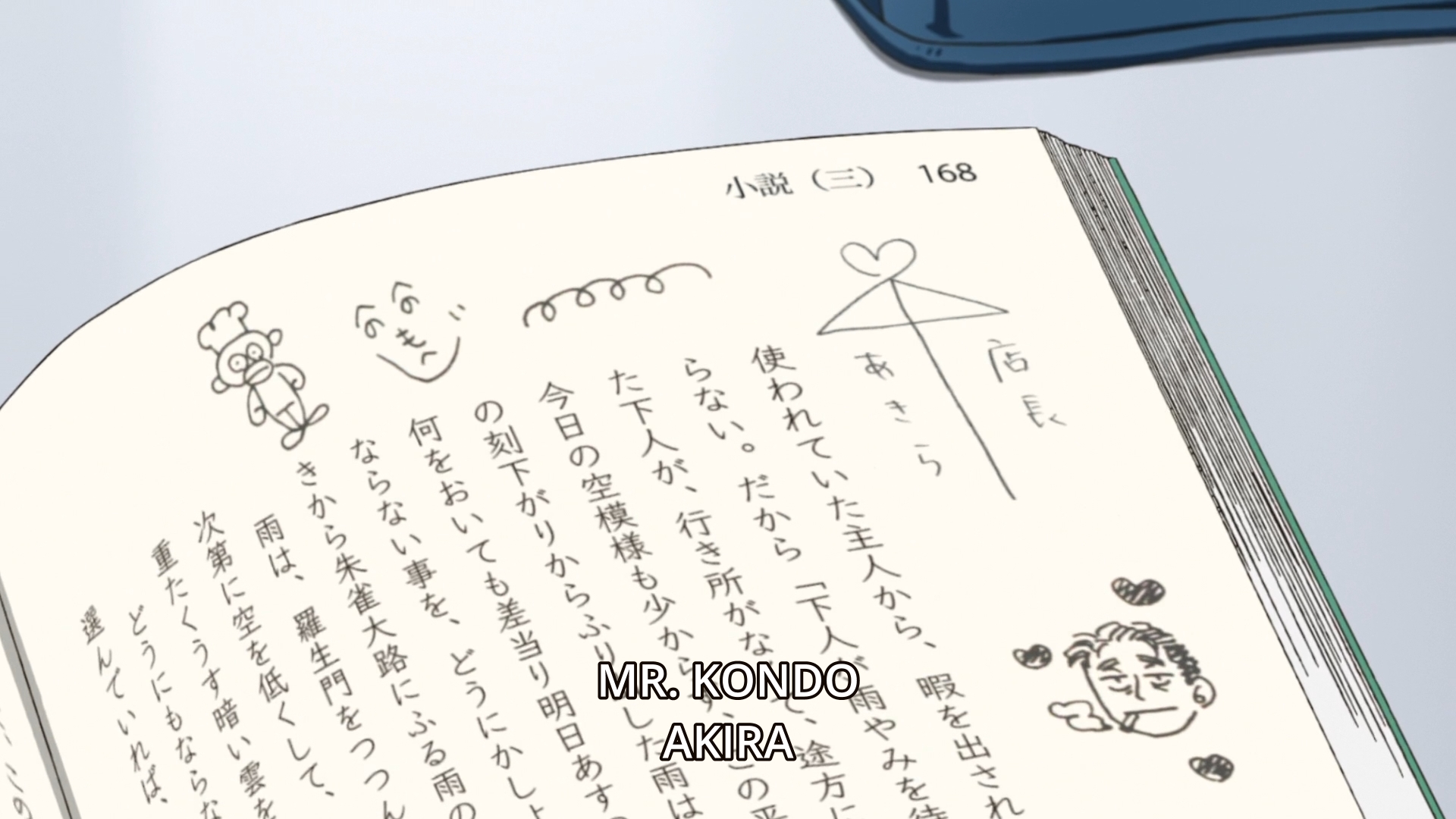 — I’ve never seen anyone have such a hearty chuckle over a remedial class. His curiosity is then piqued when she mentions the short story “Rashomon.” What a coincidence: the servant in the story also had a pimple on one of his cheeks. But of course, that pimple had symbolism! The servant wanted to live a righteous life, but the pimple festered and festered until he too became a parasite. What symbolism does Akira’s pimple have (if any)? Well, I’d say Kondo has a festering problem he can’t keep brushing off, but I don’t know if I can say the same about the girl. Maybe there are looming troubles ahead. We haven’t exactly wrapped up Kase’s subplot. Plus, what would people say if her secret crush ever got out?