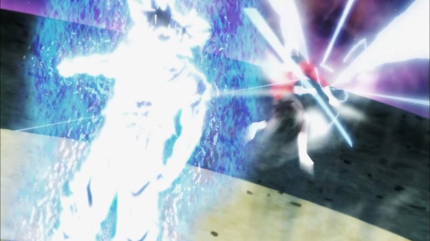 Even though all the promo stuff already showed us what mastered Ultra Instinct Goku would look like, it still took all episode for him to reach that form. Yep, that’s Dragon Ball for you. For a casual fan like myself, the old adage still holds true: just watch the last five minutes of every episode. Everything before those five minutes are wholly unnecessary. Plus, I find the whole thing a bit lacking in drama. It really feels like Goku stumbles onto this form out of nowhere. Nobody had to die like Krillin or Android 16. The bad guy isn’t even really a bad guy. Goku just gets pushed to the limit then blammo, Ultra Instinct. Eh. There’s no juicy drama here. Sure, sure, the entire universe will be wiped out if he doesn’t win the tournament… but I dunno, the threat doesn’t feel credible. After all, they already told us that this entire series happens right before the last episode of DBZ. Anyways, thanks to Dragon Ball‘s penchant for dragging things out, you’re lucky if you get one hype moment per episode. Last but not least, Goku’s incomplete Ultra Instinct form looks way cooler than his mastered form.