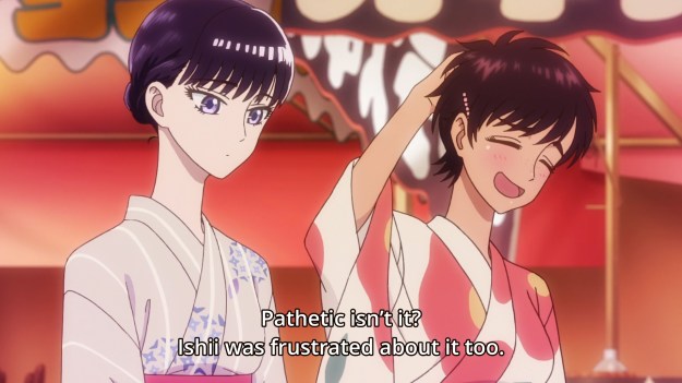 Honestly, Haruka is overreacting. If Akira can’t be on the team anymore, then yes, the dynamic between them has irrevocably changed. As harsh as that sounds, it’s also the truth. But this doesn’t mean that what their friendship has changed to necessarily has to be a bad thing. But oftentimes, relationships do fall apart this way. One side grows and/or changes, and the other side can’t accept it. By extending an invitation tonight, Akira is at least making an earnest attempt to reconnect with Haruka. She should be commended for that. She wants to reestablish their friendship even if it has to move in a different direction. Why can’t they just hang out at the summer festival and see where things go from there? Unfortunately, Haruka couldn’t help dredging up the past — and ergo, the team — and as a result, she creates unnecessary drama.