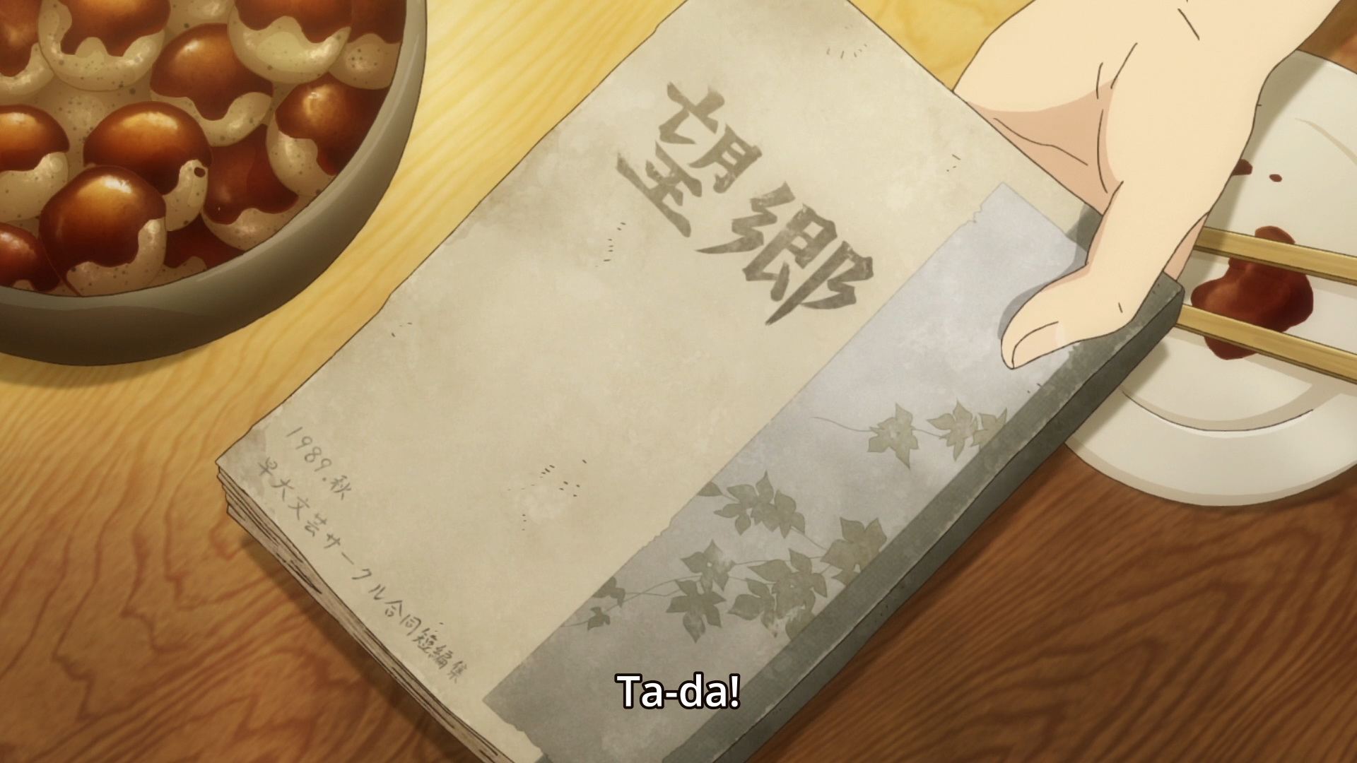 — More relics from the past are unearthed; Chihiro digs up an issue from a magazine that these two used to publish together. Naturally, it’s a magazine about literature.
