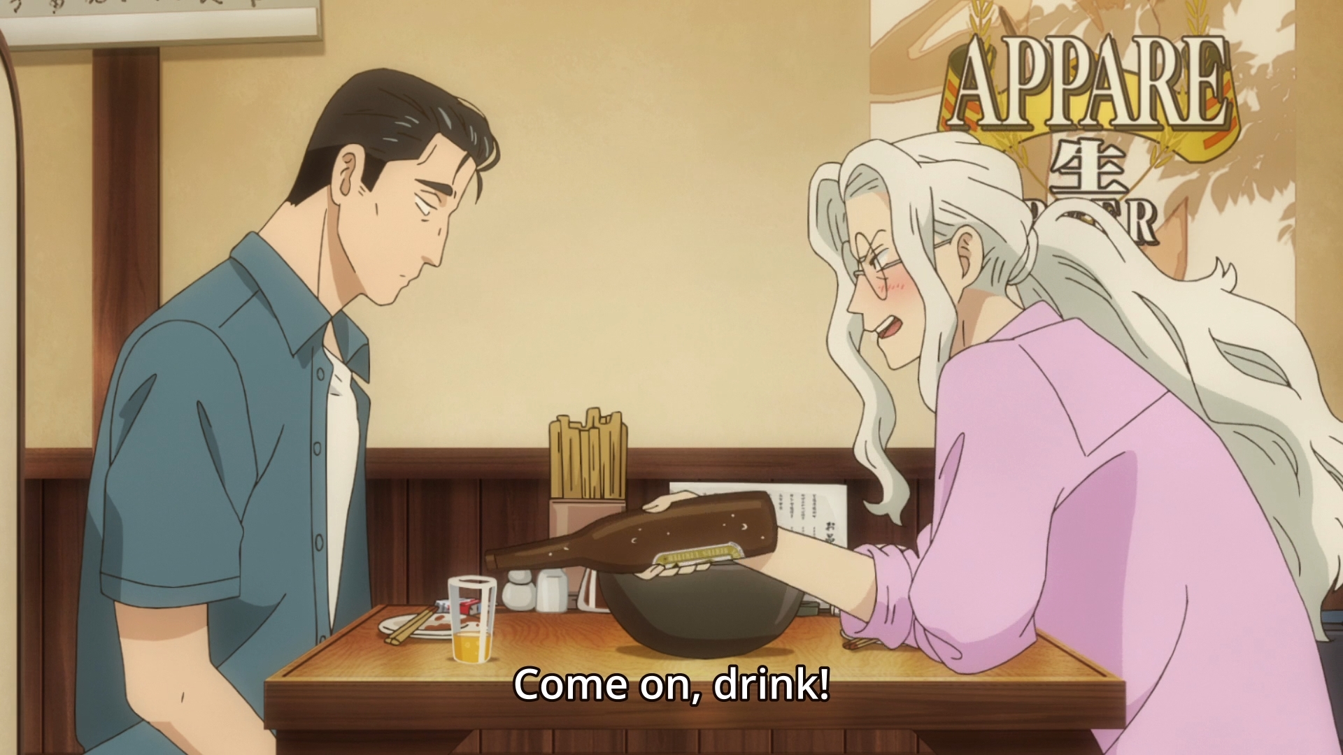 — Kondo opens up to his former best friend, but like Haruka, Chihiro doesn’t seem to be the most sensitive sort. He doesn’t flip out like Haruka, but his response just comes across as a bit… hollow, I guess? He tells Kondo that he’ll always lend an ear, but it feels forced. Drink up, drink up! Drown your feelings in alcohol!