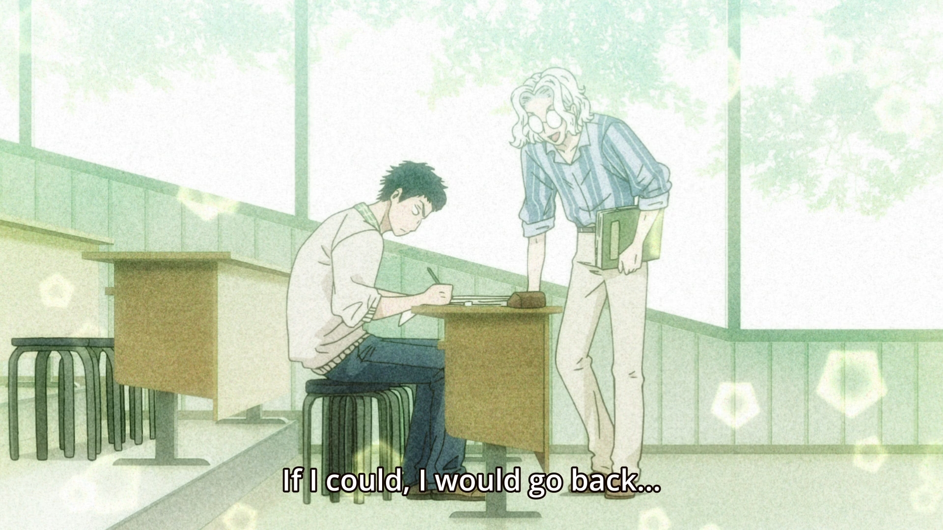 — Chihiro tells Kondo that they’re not adults. Rather, they’re still classmates. And this is exactly why they haven’t seen each other in ten years. Kondo has no business pretending to be a college-aged student. If their relationship would actually change and evolve to fit adulthood, then they’d still be in each other’s lives. But because one side insists on keeping things the same as how they used to be, the best that these two can do is meet up once in a blue moon and reminisce over fossils like their self-published magazine. I’m sure Kondo had a great time tonight. I’m sure he had fun seeing Chihiro again. Nevertheless, it’s not as though they’re going to hang out regularly again. They have both become men, but their friendship hasn’t grown at all.