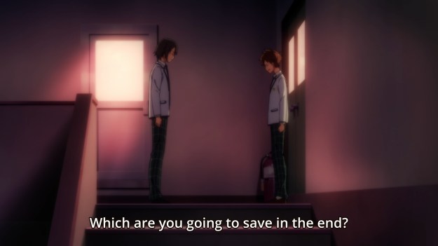 — Anyways, the show is trying to convey the existential threat of androids. If androids are superior to us in every other way — strength, speed, intelligence, etc. — then aren’t humans obsolete? Ah, but humans aren’t obsolete if we continue treating the androids like objects! Good ol’ discrimination will do the trick! In any case, I get it. Regular humans don’t have a place if these hIEs can simply replace them. The problem is that this debate is being carried out between two clueless high school students. They don’t exactly have the most interesting takes. Case in point, Ryo is going about it the wrong way, though: “You shouldn’t care about Lacia at all!” Dude, that’s never gonna work. In fact, he’s too late. Pandora’s box has already been opened. The only way to hold back this tide is to never create advanced AI in the first place. Getting mad at Arato isn’t going to solve anything. The capability to create Lacia is out there. Even if the one we know and love gets destroyed, another one can be made in her image. Ryo eventually asks Arato who the latter will choose: humans or objects? False dichotomy, my brother! That’s a false dichotomy if I’ve ever seen one!