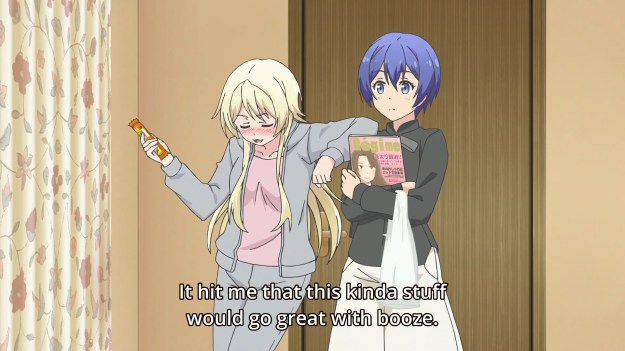 Oh shit, they did! Kinda. Eh, close enough. Anyways, Michiru is trying to lose some weight, so she refuses the umaibo snacks at first. But if she wants to lose weight, why is she drinking every single week? It’s really quite funny how young people casually indulge themselves in drinks after drinks, then act all surprised that all those calories eventually add up.