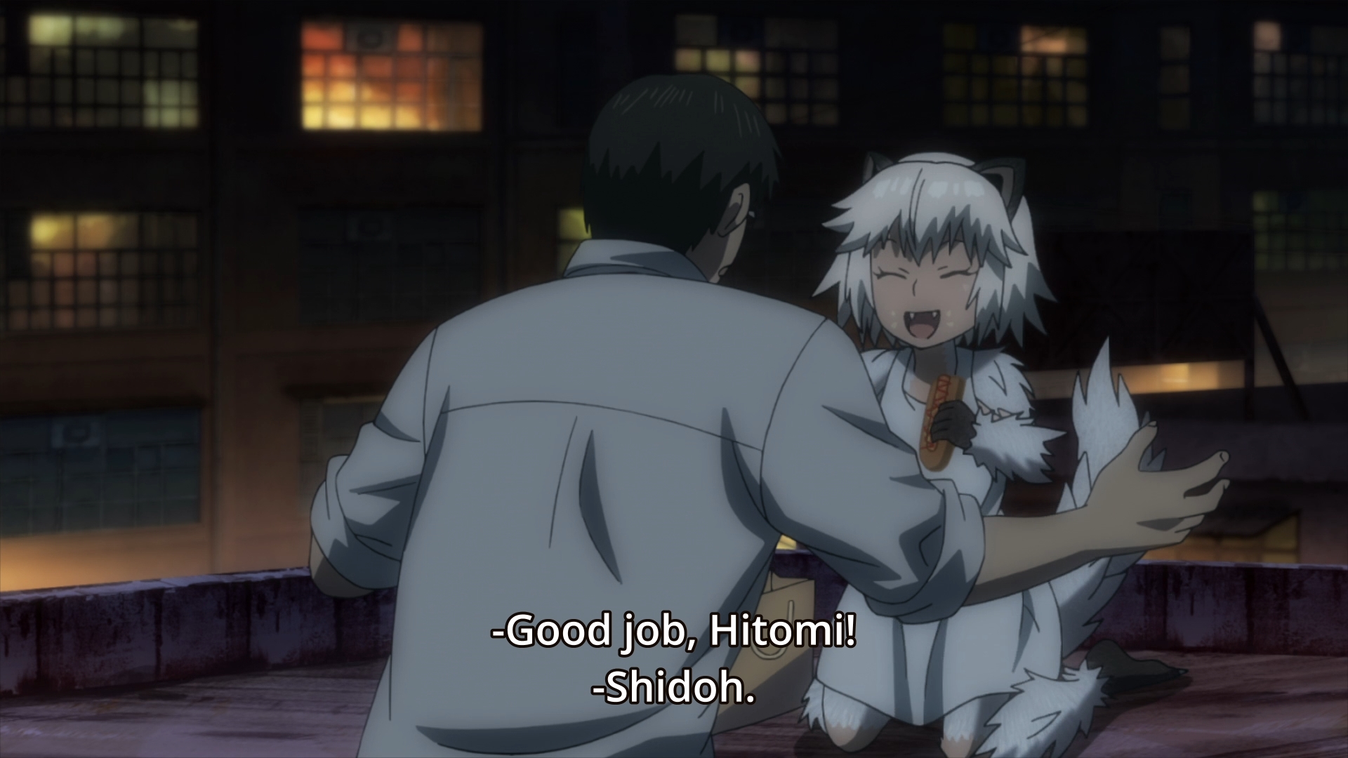 — What immediately follows is incredibly boring. Shidoh managed to tame Loli Hitomi with food, then he taught her how to talk. Eventually, he had to protect her from Chinese gangsters, and this is why she’s so goddamn loyal to him. In the end, Shinozaki saved them both because Shidoh obviously can’t fight. Who’s Shinozaki? Oh, just that wild announcer we’ve been listening to over and over. Yep, she can apparently kick ass.