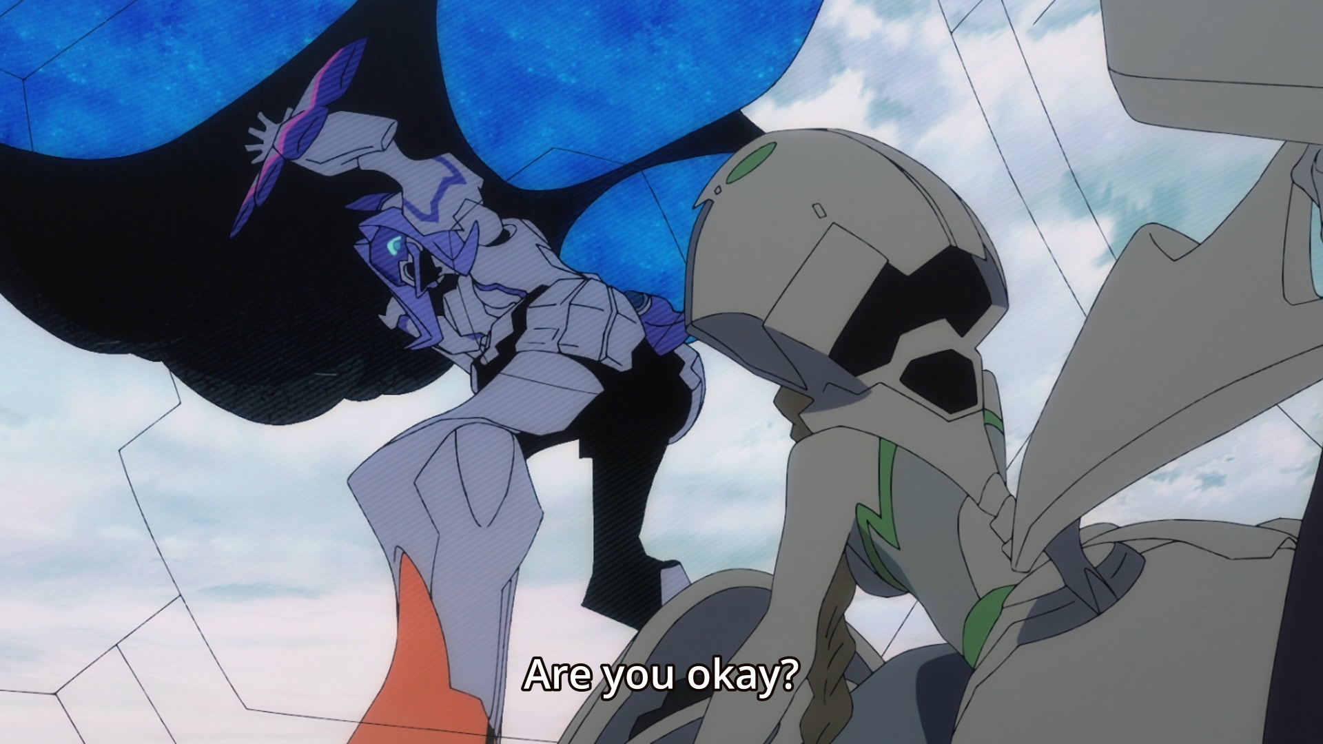 On the battlefield, their compatibility remains high. Well, high enough to get the job done. Zero-Two and Hiro’s partnership has always been different from everyone else; they actually share control over Strelizia. Hiro is often content to let Zero-Two do her own thing, and that works for them 99% of the time. This week, however, the situation gets a little messy. When a Gutenberg-class klaxosaur shows up, Zero-Two immediately rushes Strelizia into battle. At one point, Hiro has to restrain her from getting too reckless. Clearly, she’s hungry for a fight, but why is that? Zero-Two likely feels as though she’s losing her identity by being on this team. On the one hand, she wants to be human. She doesn’t want to identify herself as monster like these klaxosaur. On the other hand, joining a team has made her soft. It has made her yearn for intimacy and camaraderie from Hiro and the rest of the kids respectively. As a result, she throws herself head first into battle because it’s what she’s always known. What’s familiar to us also feels safe to us. In contrast, her partnership with Hiro is unexplored territory. She wants a darling, but only a darling that she can die with. She has never considered growing old with her darling. This realization frightens her partner, though.