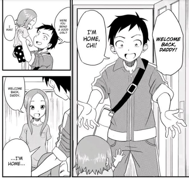 Nishikata finally managed to land a critical hit on Takagi without realizing it. It was such a cute moment that I decided to look up that spin-off manga where he and Takagi have grown up and gotten married. They also have an adorable daughter named Chi: