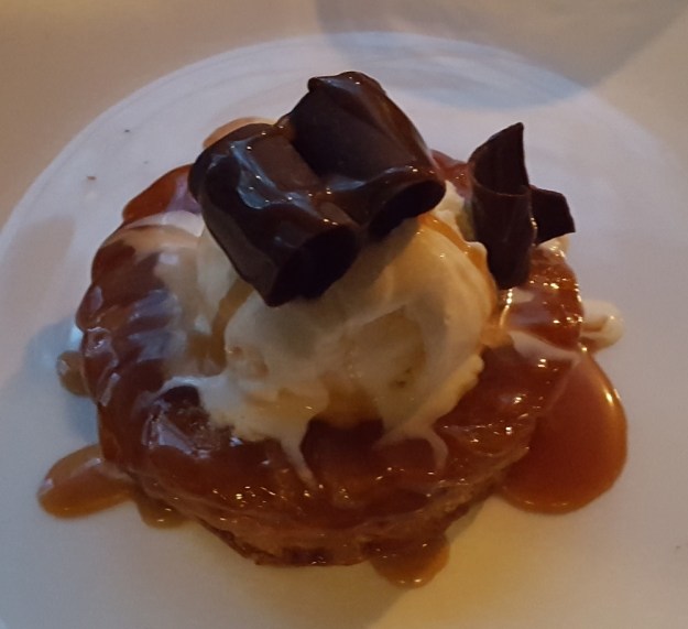 My dessert was a banana tarte tatin. It looked nice, but I couldn’t finish the dish. There was a strange bitter aftertaste from the caramel sauce. All in all, the whole dinner was a huge letdown. The service was bad too, but I don’t wanna get into that.