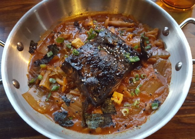 My main was a black garlic and miso salmon fillet swimming in a kimchee stew. The kimchee flavors were really muted. Not enough spice, not enough pungency. The salmon was okay, I guess.