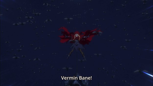 Well, we finally get to see more than just Climb do battle this week, so that’s cool. Evileye can defeat Entoma, the insect maid, and all it takes is a can of Raid. Unfortunately, she can’t beat Demiurge (naturally), but Momon shows up “out of nowhere” to save the day. No, really, that’s the master plan. He’s going to pretend to defeat the big, bad demon boss, this’ll make all the weaklings fall in love with him. And by fall in love, I really mean Evileye falling in love with him, ’cause every goddamn isekai show is just a harem series in disguise. Ho-hum. The show’s kinda predictable. But like I said, I’m still thankful for the fact that I didn’t have to spend most of the episode gawking at Climb fumbling around with his sword.