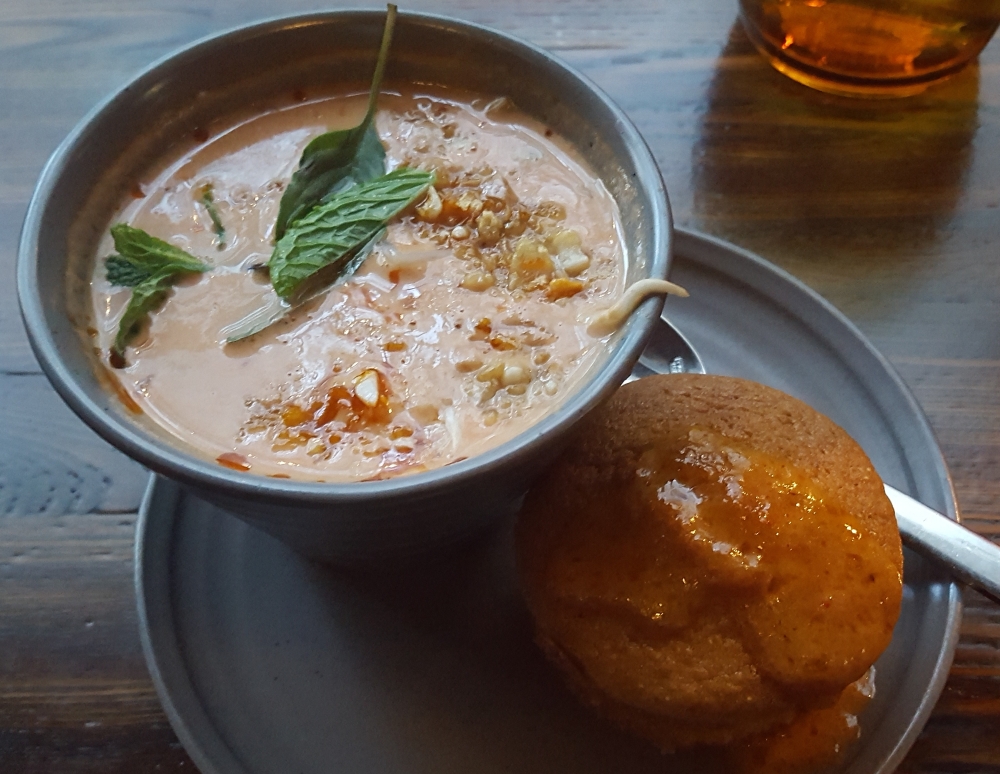 My appetizer was a red curry soup with dungeness crab, but I tasted neither curry nor crab. It was very sour. In fact, it kinda reminded me of a sweet and sour soup in Vietnamese cuisine. On the side, you’ll see a cornbread topped with more red curry. The first bite was fine, but the whole thing was too sweet. Also too large a portion for such a tiny amount of soup.