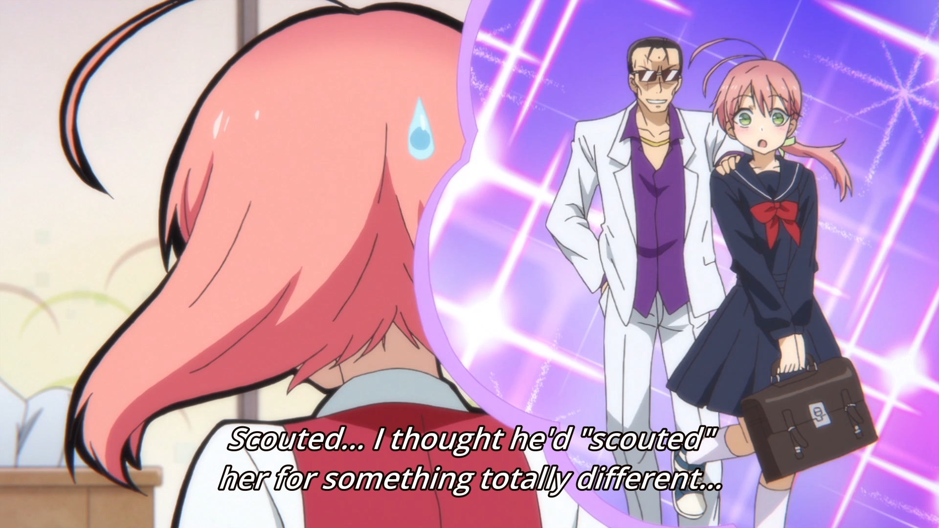 Once the novelty wears off, what you have left is a pretty boring show. I really tried to give this anime my fullest attention, but it probably would’ve been better served as a short. But let’s start from the beginning. At night, our heroine dreams of being a mahou shoujo, but during the day, she’s one-half of an unpopular idol duo. The other half of the group is her well-endowed best friend Sakuyo. Speaking of Sakuyo, Saki pines for her best friend’s older brother Mohiro. He, too, is an idol, and a very popular one in fact. Ironically, he has the personality of a tree stump. See? This show is already incredibly subversive. The story is flimsy at best; the girl is only in love with Mohiro because he’s the quiet type who once saved her in a generic anime flashback incident. It’s questionable if the guy even cares about the girl at all. Mohiro certainly seems more impressed with guys than girls. Nevertheless, she became an idol hoping that her senpai would eventually come to notice her.