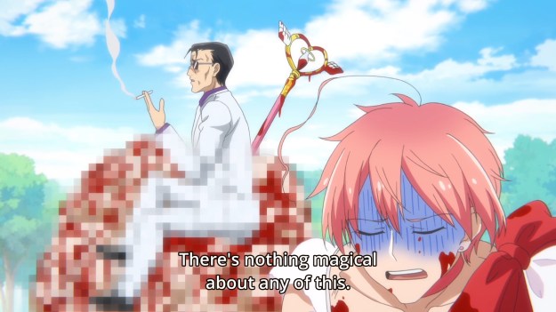 One day, Saki returns home to find a yakuza screaming outside her home. He’s looking for her mother, and at first, our heroine thinks her mother was involved in something shady. The woman soon reveals, however, that she used to be quite the heroine herself. After all, every neighborhood needs to be protected, and the one that they live in is no different. Unfortunately, the mahou shoujo business is for young, cute girls and Saki’s mother is getting a little long in the tooth. As a result, the yakuza turns his attention to Saki. Our heroine barely has any time to consider the full ramifications of becoming a mahou shoujo when she learns that her crush Mohiro is about to be dragged to the underworld by a bunch of weirdly cute but simultaneously ripped demons. Saki has no choice but to transform into a mahou shoujo, and… well, you can imagine the rest. Eventually, Sakuyo also joins Saki in becoming a mahou shoujo, because she has a crush on her best friend. There’s some additional nonsense like how Mohiro’s partner is likely the bad guy pulling the strings in the background, but at this point, who even cares?