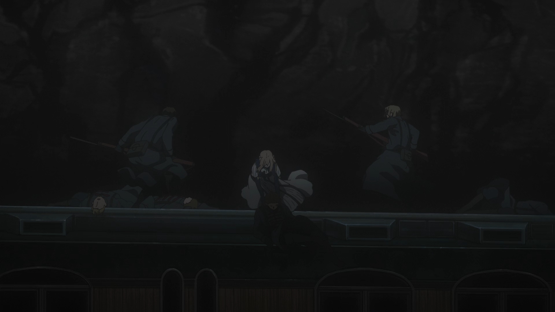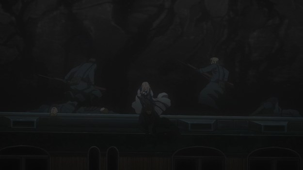 — Violet eventually runs into a contingent of enemy soldiers on top of the train cars. They all have rifles with bayonets. She has… well, her fists.