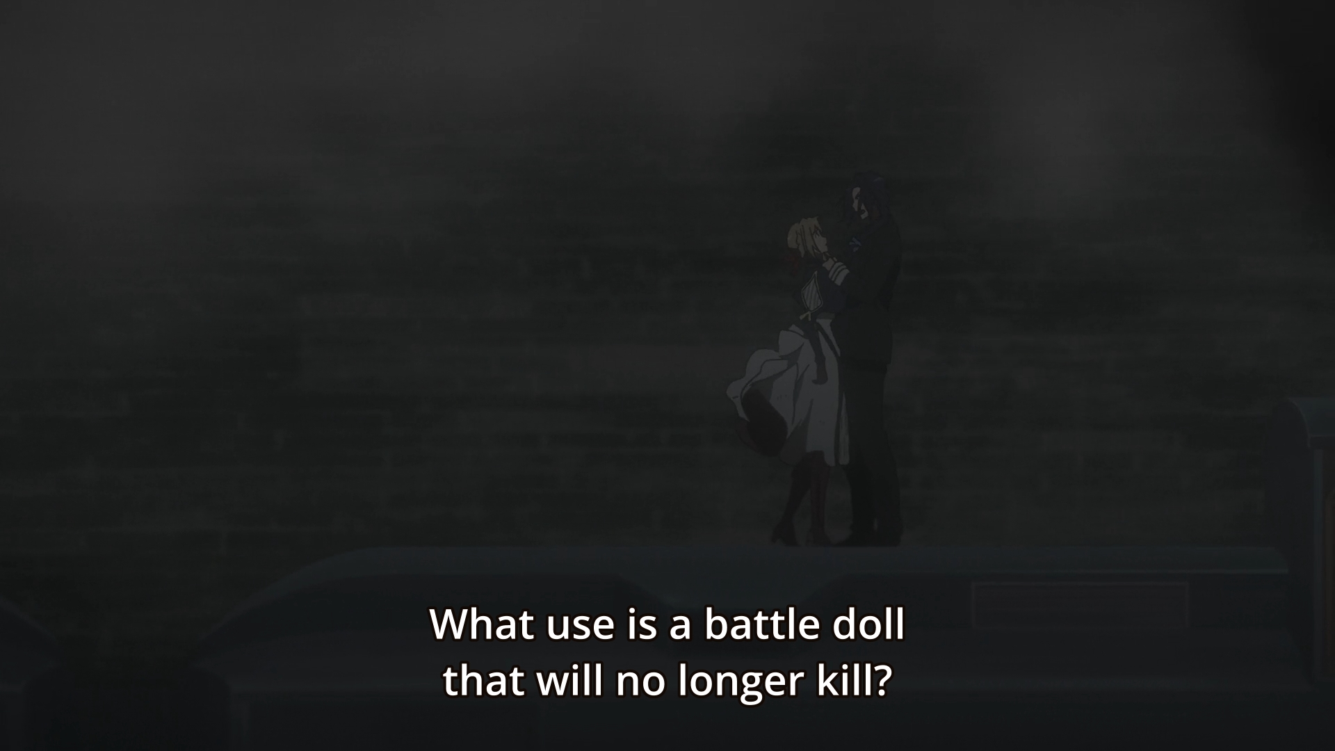 — I understand thematically what the episode is trying to accomplish. Violet is fighting for peace; she’s trying to protect the special envoy. Not only that, she’s doing her best not to kill any of the enemy soldiers. But her past can’t escape her. One look at Violet in combat, and the enemy commander can’t help but recall the girl’s infamous nickname on the battlefield: The Battle Doll of Leidenschaftlich. You have the duality of past and present tearing the girl apart. On the one hand, she’s used to be a butcher on the battlefield. On the other hand, the pendulum has now swung so far to the other side that her desire for peace may very well cost the girl her life.