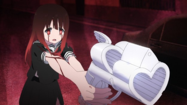 One night, Aya’s laptop magically comes to life, and a strange, creepy girl decides to grant Aya magical powers. Basically, she gets a toy gun. Unfortunately, the girl finds out the next day that the bullies have killed her cat. Not only that, they try to have an upperclassman rape Aya. With nowhere to run, the girl desperately reaches for her toy gun and pulls the trigger. This somehow teleports two of her attackers right on top of the train tracks, and as a result, they meet the same fate as the poor cat. More importantly, this is where the show’s dangerous misanthropy takes shape. Did you feel anything when those bullies died? Were you horrified like Aya? Probably not. But that’s what the show wants, is it not? Aya isn’t cruelly and relentlessly bullied on all sides because we’re trying to raise awareness for bullying victims. Rather, she’s bullied so that we may hate. The poor cat is murdered so that we may hate.