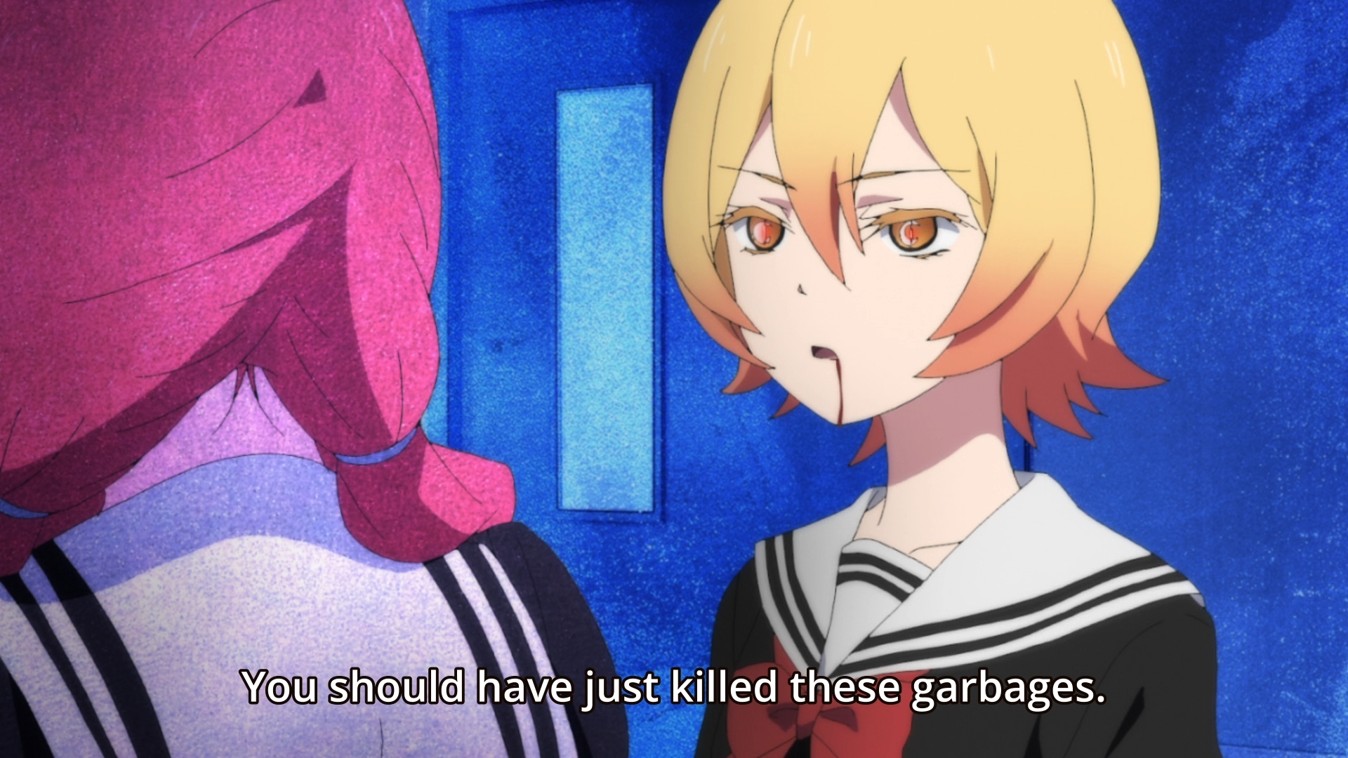 Near the end of the episode, the ringleader threatens to cut Aya’s mouth with a box cutter as revenge. She doesn’t have any proof that Aya is responsible for her friends’ deaths, but she doesn’t care. All of a sudden, time freezes for everyone but Aya and a new girl. Tsuyuno enters the restroom and makes it known to the girl that she’s a mahou shoujo as well. If you haven’t already guessed, she can stop time. She then nonchalantly takes the box cutter and slices the ringleader’s throat. Just. Like. That. No emotion, no anything. “There,” she says, “Just another unfortunate accident.” She even chides our heroine for not doing it first. Of course, I can easily imagine that Aya will retain her soft-hearted kindness. She’ll be the one who never quite gets used to the brutality required of her in order to survive in this comically sadistic world. Nevertheless, it’s not just about her. It’s about you and me as well. It’s about what the audience feels. If the show can convince us that it’s okay to murder kids — no matter how ridiculously evil they are portrayed — then that’s a problem.