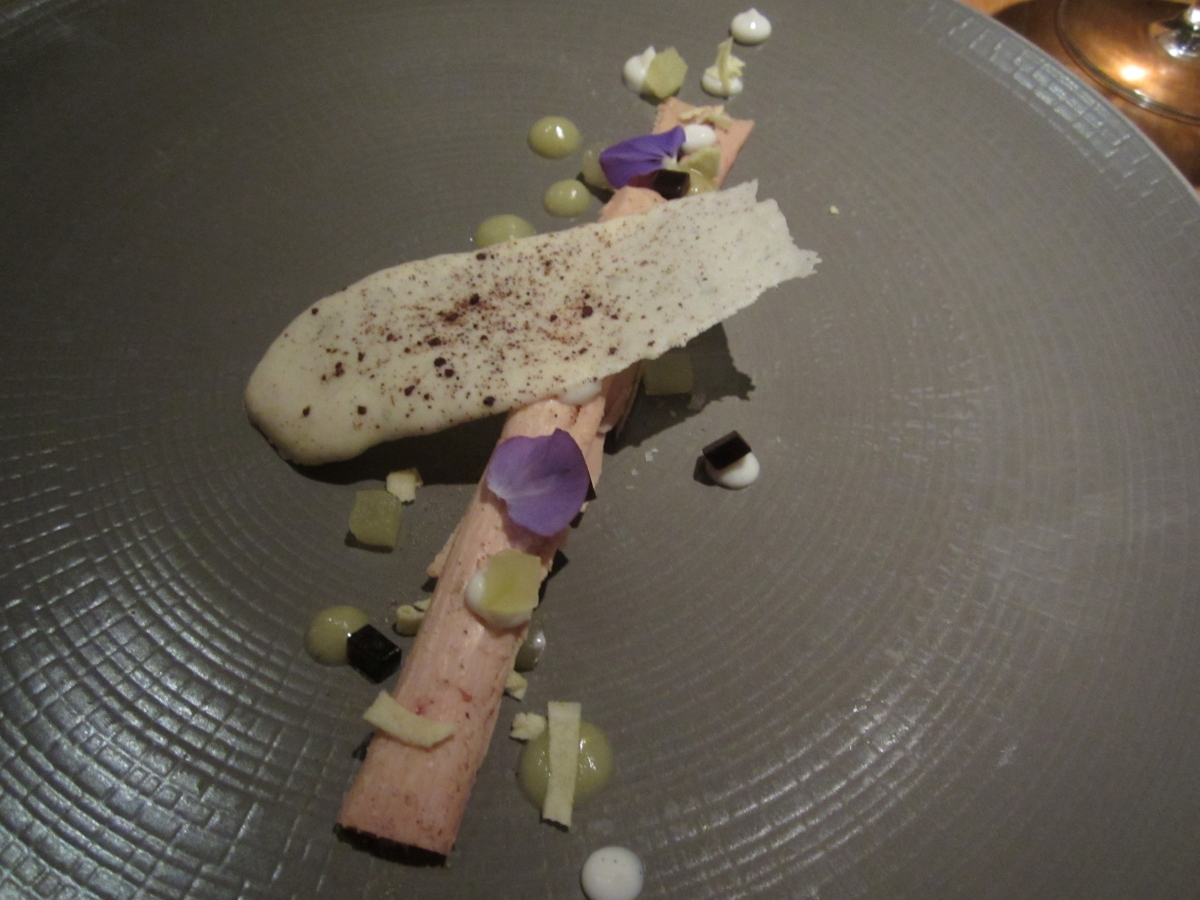 What you have here is foie gras torchon that had been initially frozen. This allows the chef to shave it in a certain way that gives the foie gras a visual texture that is similar to wood.