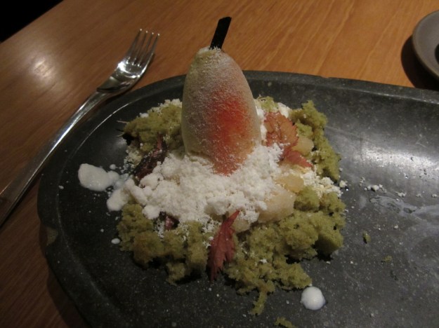 To extend the forest theme even further, we have a dish that is simply titled “pear in the snow.” The pear itself is of course a pear-flavored sorbet. It sits on top of powdered cream and cake that has been shredded to look similar to moss.