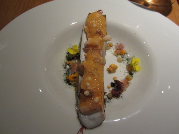 In this dish, the chef has gone and turned olive oil into snow. By using maltodextrin, you can turn any oil into powder. Maltodextrin itself shouldn’t have any flavor, and it dissolves quickly on the tongue. As a result, all you’re left with is the flavor of the oil itself. Not only does it add to the forest theme of the entire menu, you don’t have to drizzle liquid oil everywhere.