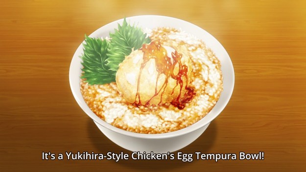 So in Azami’s latest attempts to weed out students that he consider problematic, everyone will have to undergo the Advancement Exams. If you pass, you move on. If you fail, you get expelled. Seems simple enough. Naturally, everyone’s freaking out about them except Yukihira. Erina later pays him a visit to talk about how Joichiro, Yukihira’s father, taught her to love food. Unfortunately, she no longer knows what food means to her anymore thanks to her father’s abuse. She’s lost her confidence and sense of purpose. The girl’s pouring her heart out to the main character, but he looks bored out of his goddamn mind. Oh well. He then decides to whip up a dish for Erina to taste. He’s determined to get her to say that something he’s made is delicious. He ends up making this: