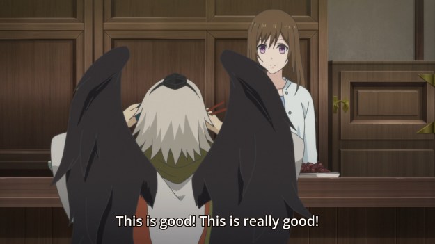 — Anyways, Aoi returns to the inn to find that a huge fight has broken out. Why? The tengu found the food to be boring, so they got drunk and started flipping tables. How nice. But look, they want good food, and Aoi apparently cooks good food! It’s like a marriage made in heaven! I mean, what a golden opportunity for her to show off her skills and generate hype for her soon-to-open eatery!