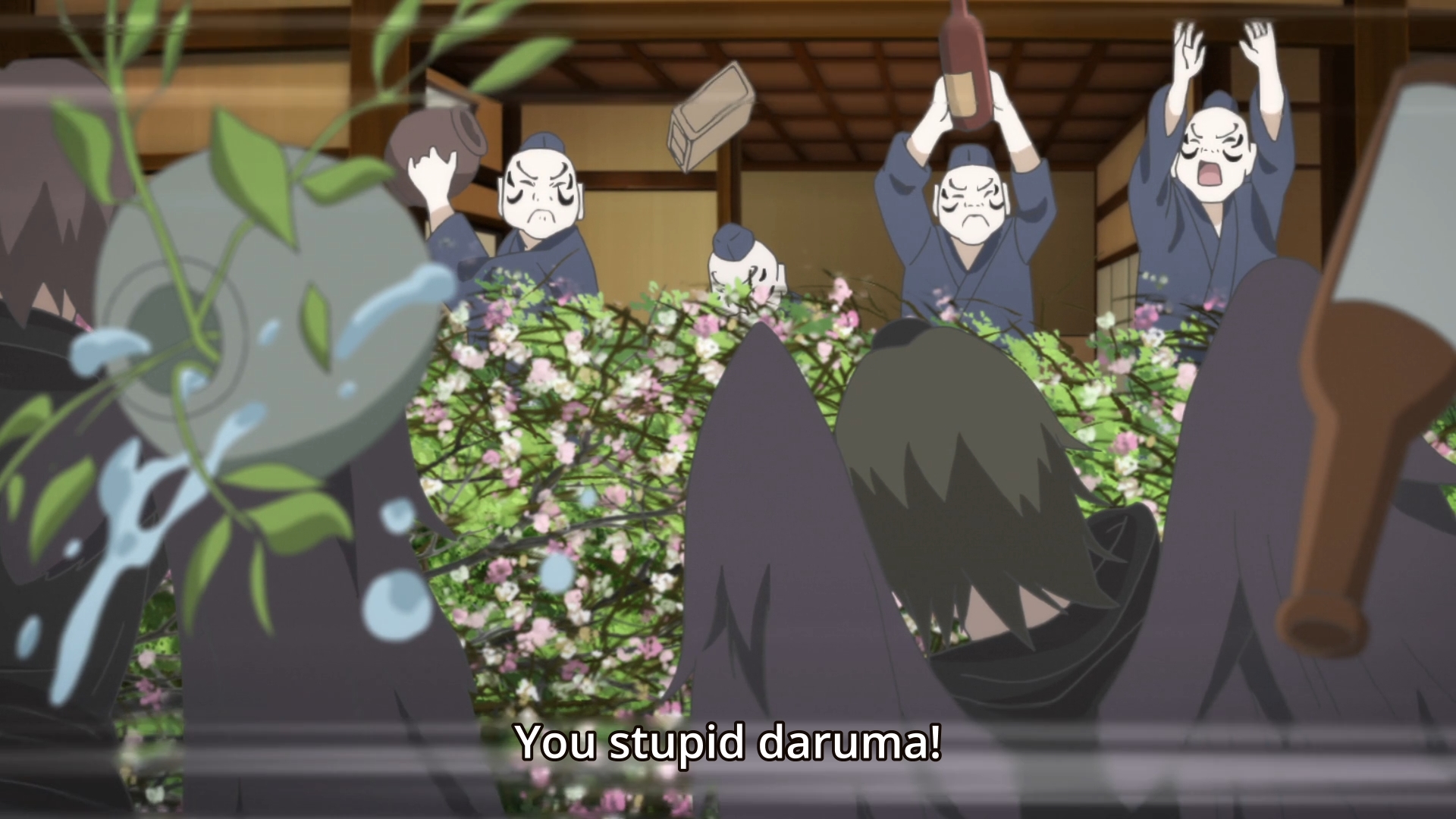 — Odanna eventually shows up and starts insulting Aoi for being curious about the situation. He threatens to eat her or feed her to the tengu if she doesn’t leave right away. Wow, what a peach. And the worst part? The show’s going to do its darndest over the next two seasons to convince us that he’s a worthwhile partner. Naturally, the poor girl runs off in frustration.