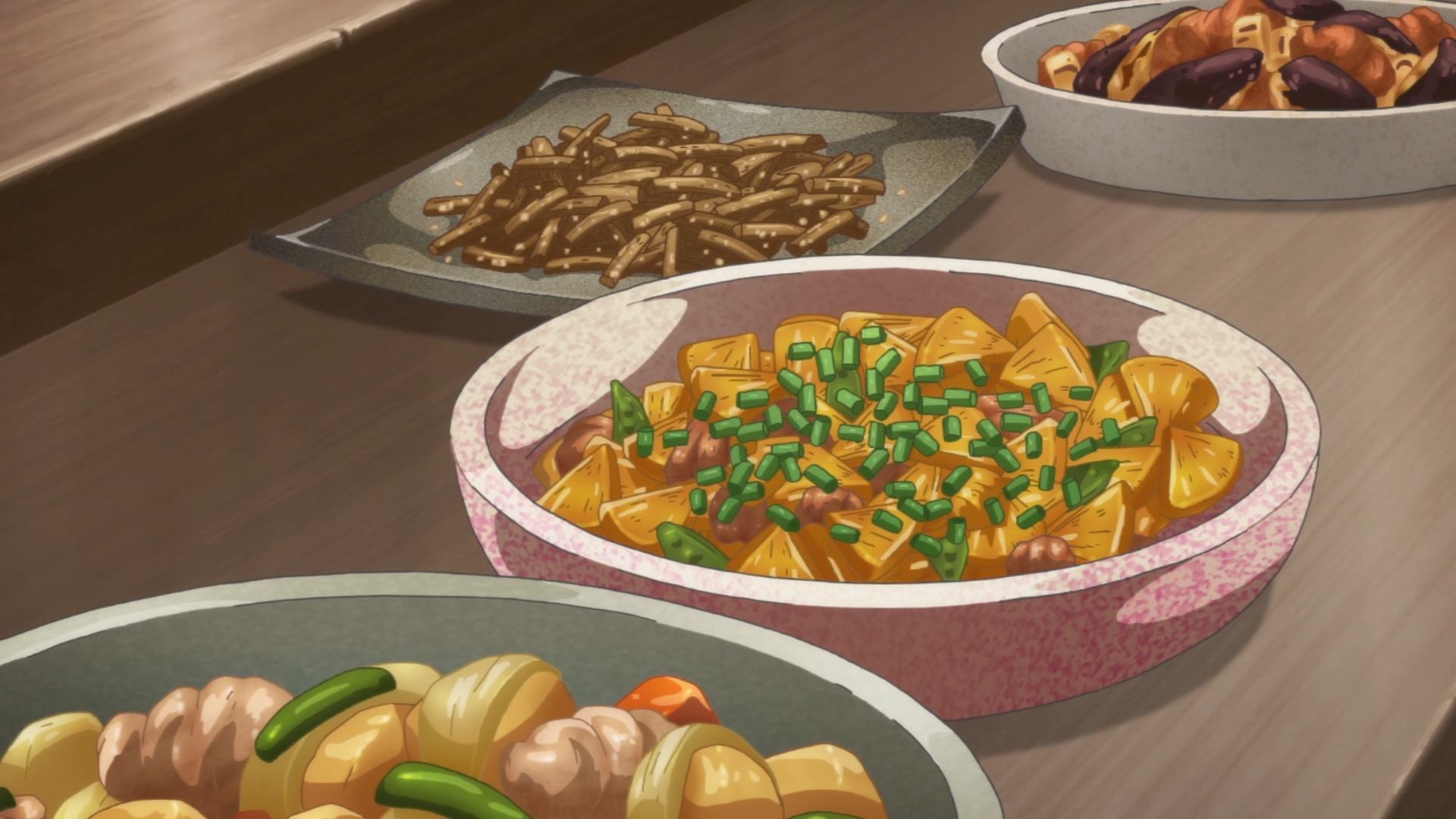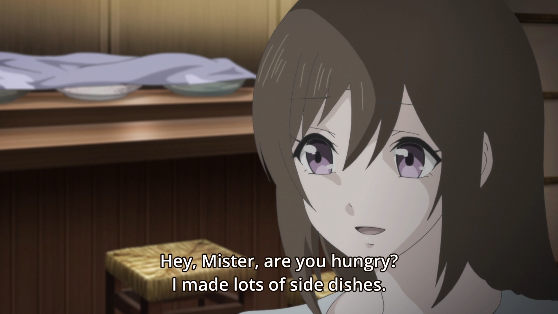 — She offers him some food, but I’m thinking that those dishes have got to be cold by now, aren’t they? They’ve just been sitting there on the counter, covered by some cloth. That’s also not very hygienic. But since it’s fiction, the food is perfectly fine for eating. It’s also super delicious. But y’know what? How funny would it be if this ends up being a better cooking anime than Shokugeki no Soma?