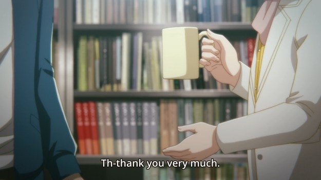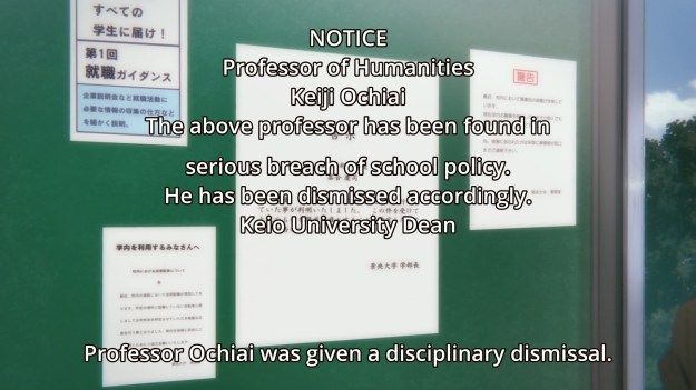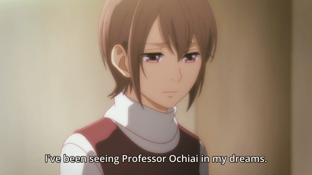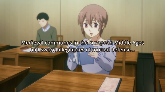 Tsukasa has even been spacing out in class. By the way, I didn’t know professors still called on college kids and had them read out loud in class. I thought that ended after high school. And why are the subs in the middle of the screen?