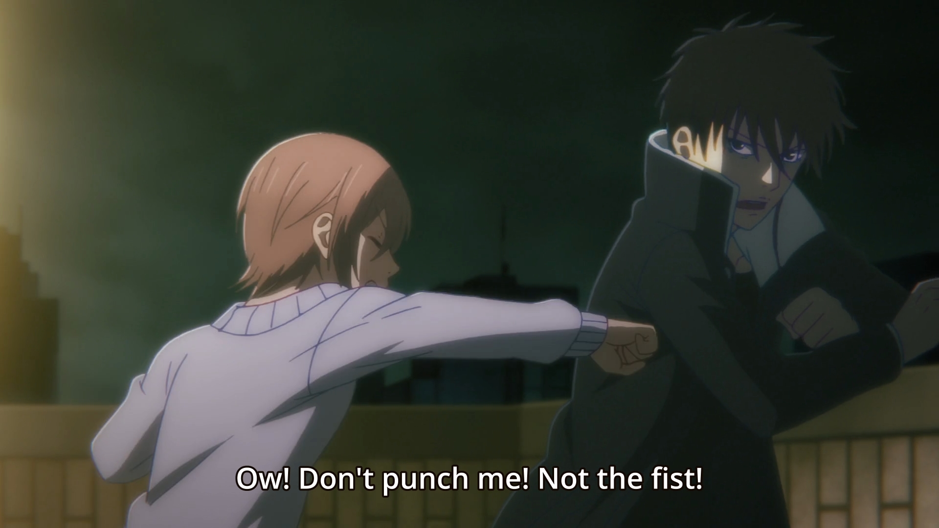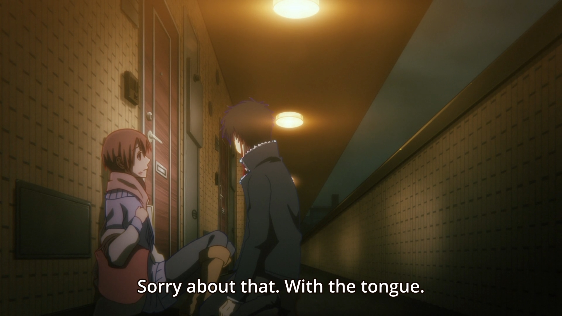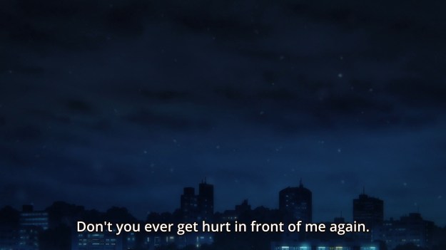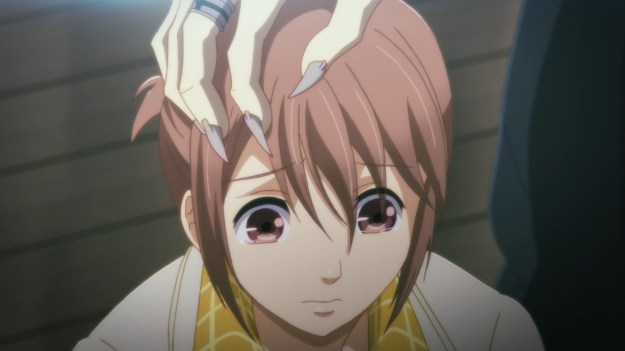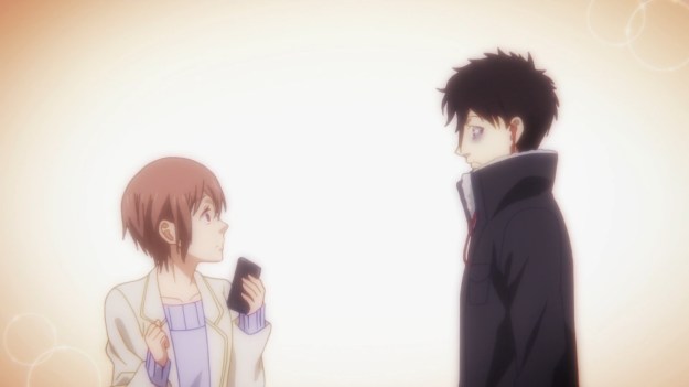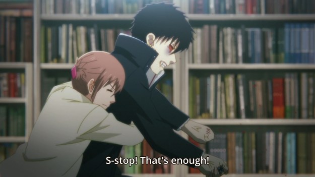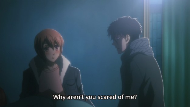 Damn; my feelings about this anime is all fucked up: one minute I’m laughing at how incompetent the storytelling is and then the next minute I’m getting frustrated at how better this could be with some reworking/repurposing of the shittly constructed scenes and faulty character writing. I genuinely believe the conceit of this show had all the makings to be a comprehensive and mature look into a society teeming with vampires and the moral implications of their governmental subjugation and dehumanization. Even more, I could have easily seen the relationship between Tsukasa and Anzai being this emotionally layered and 3-dimensional character study of two people who kinda need each other even though they fear being together due to the danger their proximity poses. Tsukasa could have been written as a college student who just started to live in the city on her own who suffers from feelings of loneliness and mild social anxiety. Her family life wasn’t all that great and due to certain anxieties, she’s kind of always been alone even though she’s had one or two classmates willing to approach her. With the recent break of vampire attacks, she’s been a victim of attack, however she’s saved by Anzai; and while he does protect her during the first official meeting, he himself loses control and unfortunately attacks her as well, making her anxiousness around people grow even more. Anzai is a pretty decent guy outside of his vampiric urges, so when he comes to, he feels the need to apologize and keep an eye on Tsukasa to make sure she isn’t too shaken up.