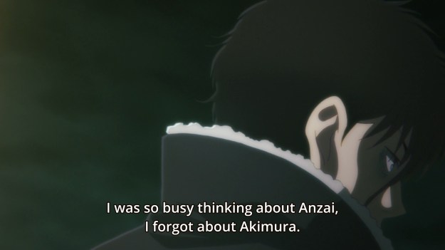 So the flashback is over, and Tsukasa starts thinking about her friend. Yeah, I get it… they had known each other for years. But still, he did kinda rape and kill three women. Afterwards, she starts to think about Anzai some more.