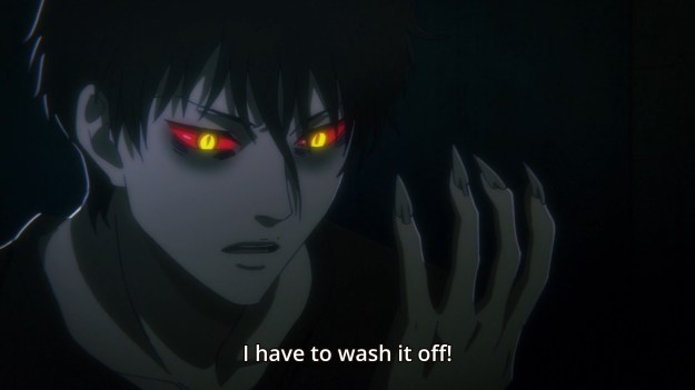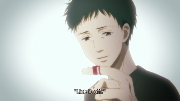 When he returns home, he discovers that he had gotten Tsukasa’s blood on one of his hands. Yeah, wash it off. You wouldn’t wanna feel any temptation. You wouldn’t want to sin in the eyes of the Lord!
