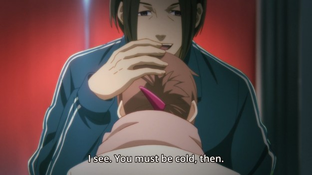 He then holds Tsukasa’s… head? Afterwards, Anzai makes his escape, because even though he’s just a cop trying to stop a rapist in his tracks, he’s not allowed to rage out as a vampire. Oh well.
