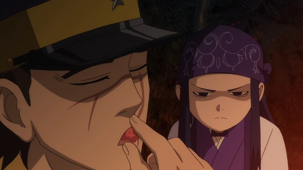 — Right off the bat, Asirpa drools as she teaches Sugimoto how to trap squirrels. We’ll soon see, however, that squirrel traps are surprisingly effective against humans as well.