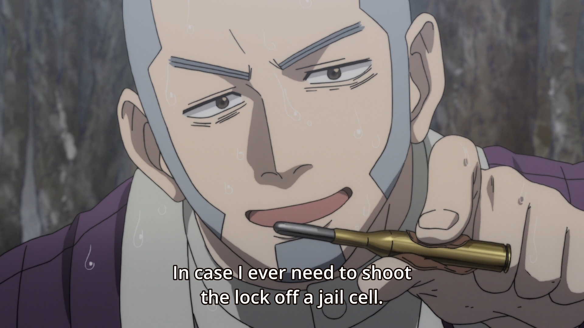 — Sugimoto then hears all about how the lead prisoner — the one that had broken them all out of jail — is apparently an old badass dude. Like, we can’t just have dangerous criminals on the lam. They also have to be anime supervillains.
