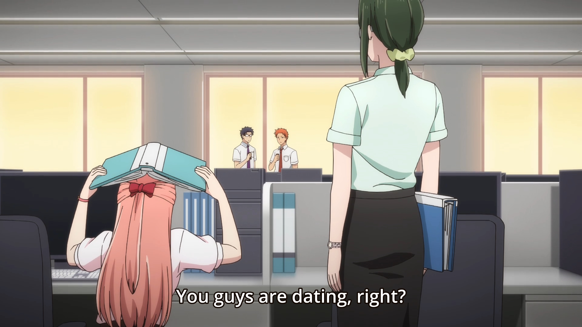 I am turned off by the disorganized and illogical romance in this anime. I was already weirded out when by how cold Momose acted when Hirotaka asked her out. And then Momose just had to run away and Hirotaka just had to misunderstand her. And of course all misunderstandings are cleared up by a hug. It’s like I’m like watching high schoolers frolic in an office. And who the hell cares about winking? There wasn’t even a segway into why they started talking about winking.