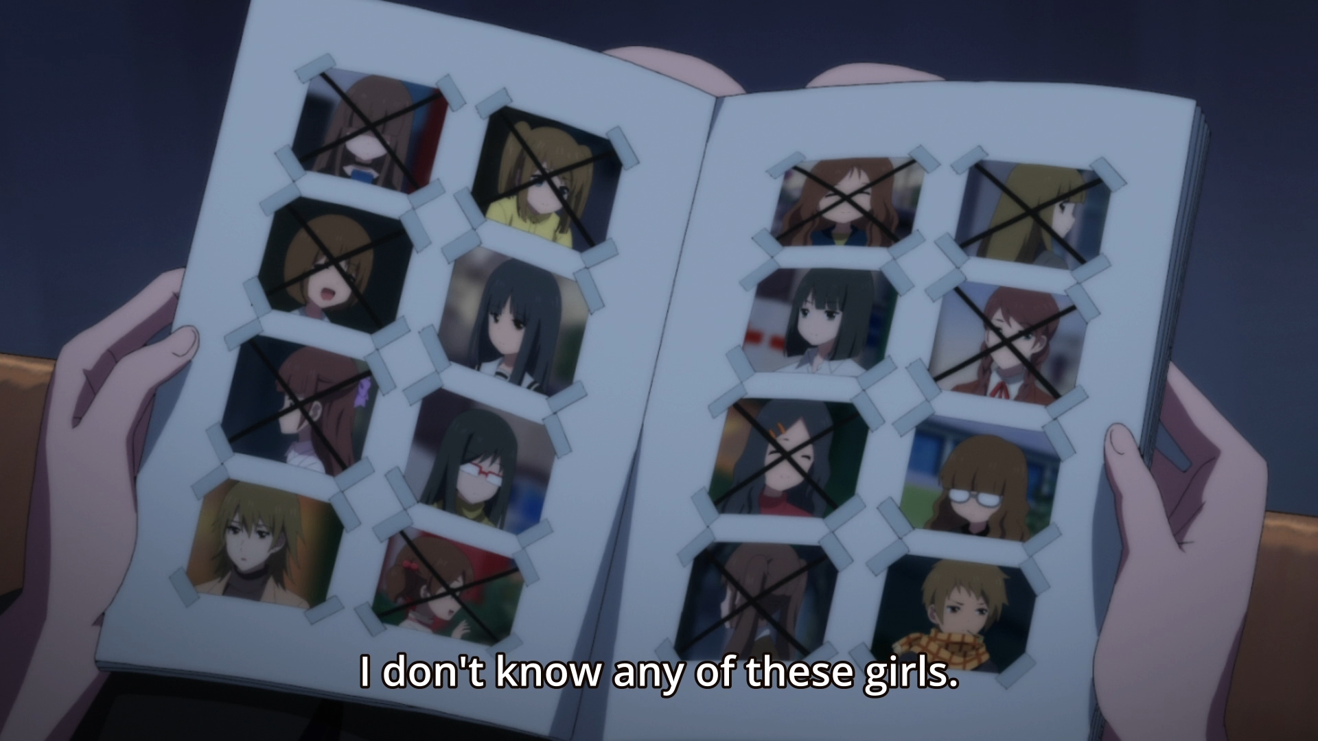— So they look through Rina’s notebook on people to kill, and it’s full of people that they don’t recognize. But how did Rina even know how to target? Is there a mahou shoujo locator app or something? Or maybe someone is feeding her information on who to kill. Either way… the only recognizable face in the notebook is, of course, our dog idol Nijimi.