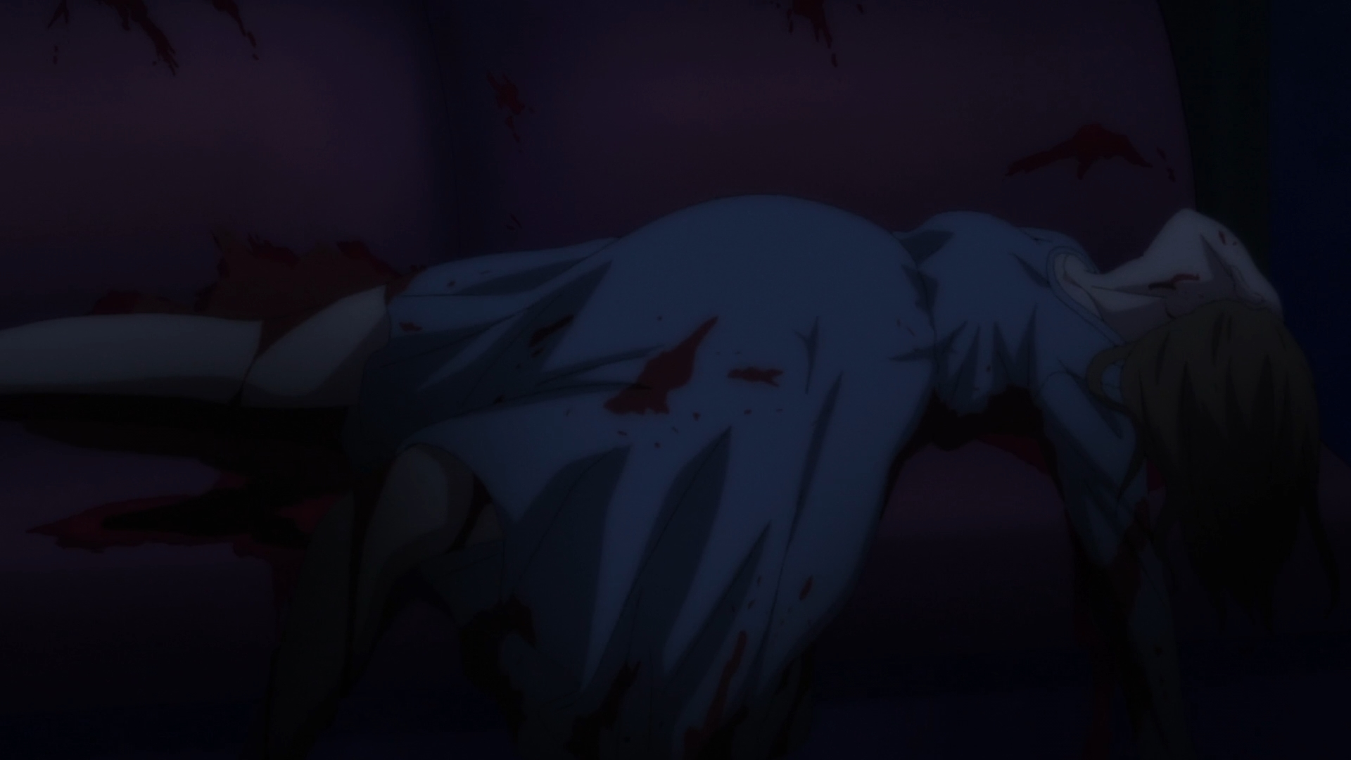 — Aya tries to ask about Tsuyuno’s past, but the girl is not forthcoming. Still, we get to see it, and so far, it appears that her parents had been brutally murdered. Just to add extra oomph to the cruelty, her mother was even pregnant when she was killed. But what happened after that is anybody’s guess. Knowing this anime, it’s probably rape and/or torture.