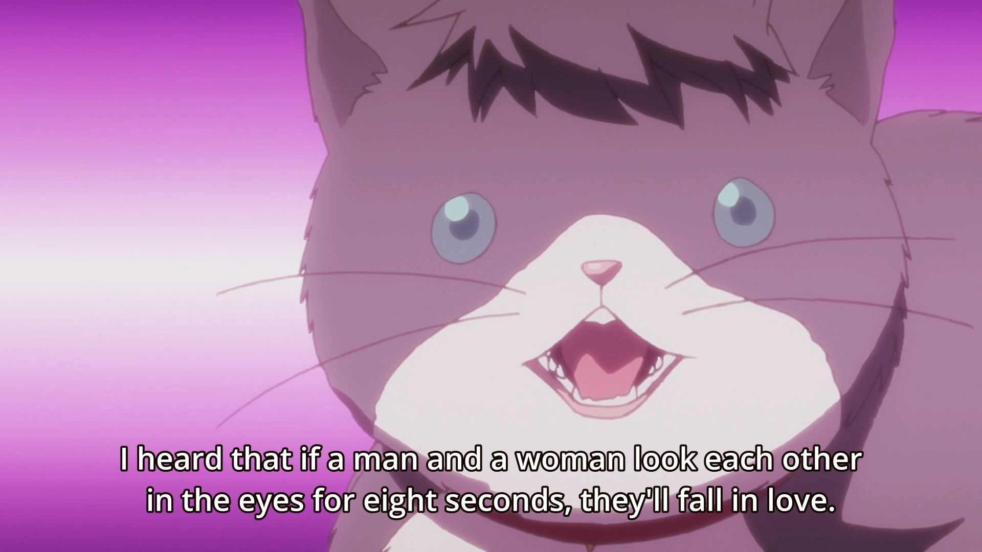 — Then to ramp up the romance just a tiny bit, the momentum of the fat cat sends her stumbling backwards, but Mitsuyoshi is right there to “catch” her. Doki doki.