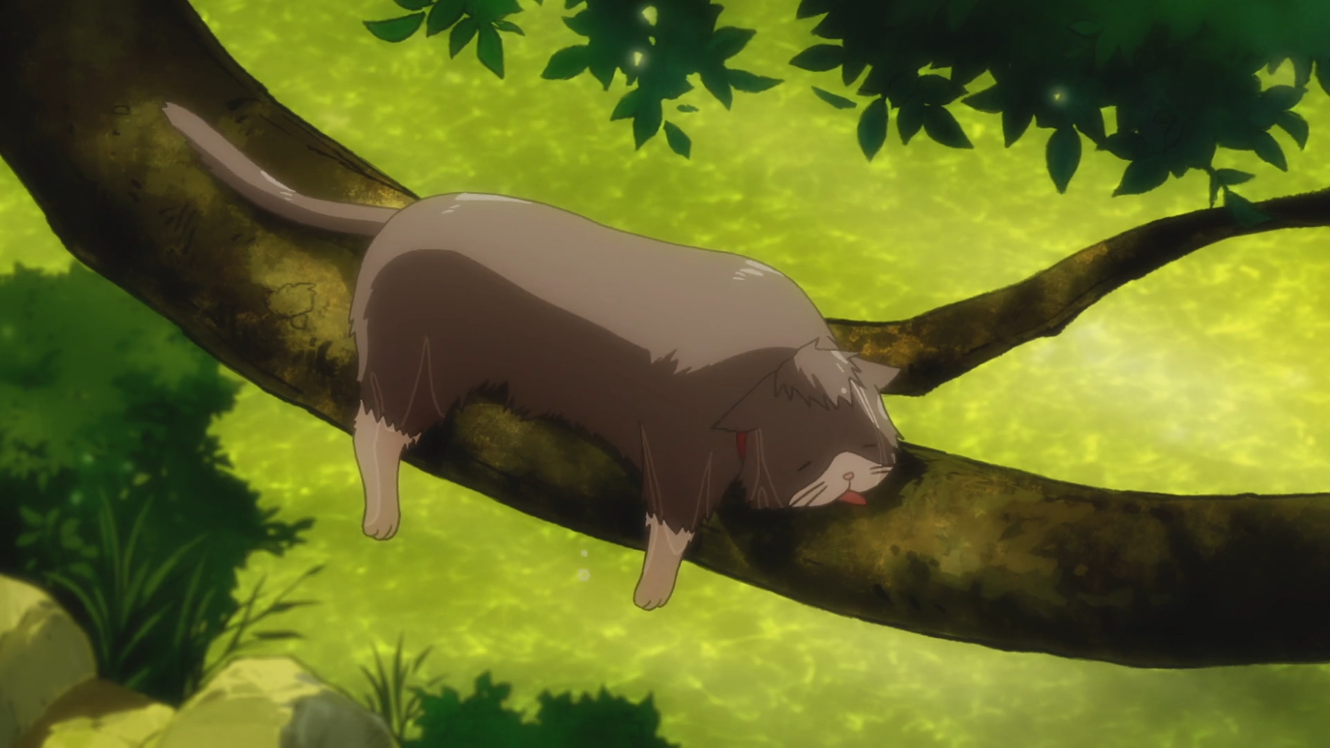 — The episode opens with Nyanko Big sitting on top of a sleeping Mitsuyoshi. The cat wants him to wake up and feed it, which is pretty typical. Luckily, my cat doesn’t do this. She doesn’t smash her belly all over my face either. Oddly enough, she respects my space while I’m sleeping. It’s a whole different story if she knows I’m awake, though.
