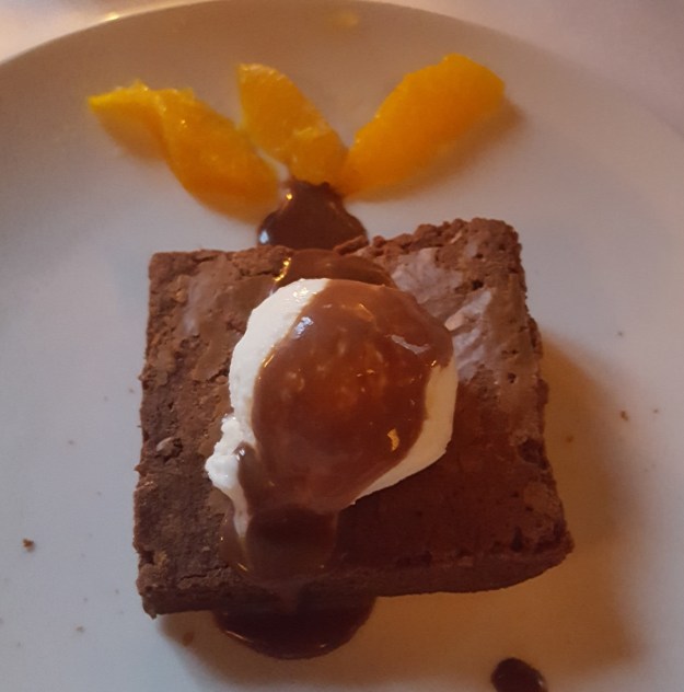 Last and very least, my dessert was this sorry-looking brownie with coconut ice cream (the best part). What you can’t see was how frozen the damn thing was. Brownies are supposed to be soft and gooey, right? I shouldn’t have to “saw” through it with my fork, right? The damn thing was like a hockey puck. None of my friends believed me until they found themselves digging through chocolate concrete. Plus, those orange segments look sad and anemic. Ah, what a disappointment. I think I’ve had better brownies from my local Safeway (it’s a shitty supermarket).